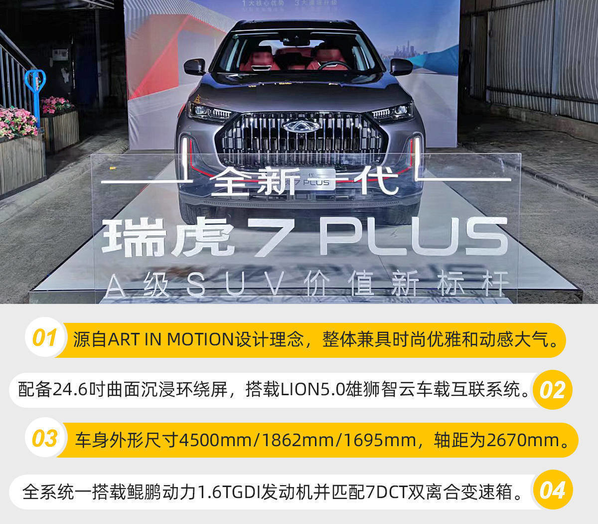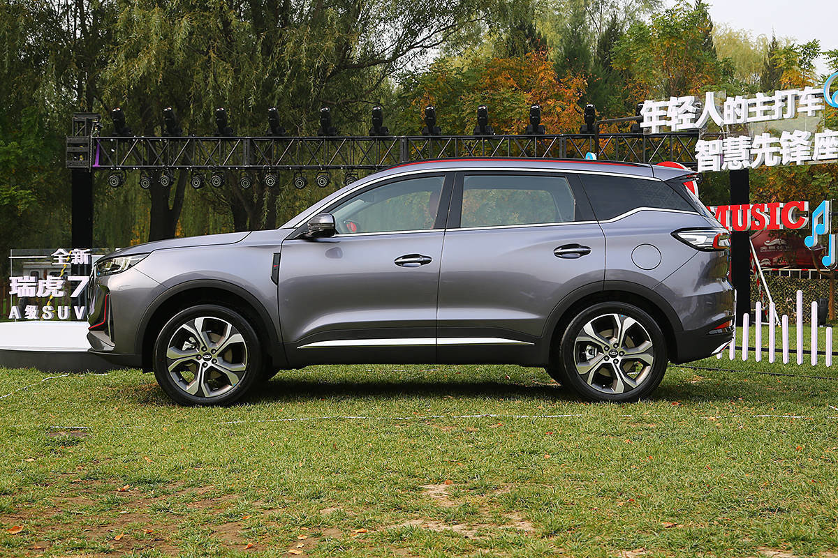 车身侧面,新款瑞虎7 PLUS采用了双腰线设计风格,在悬浮式设计的车顶和19英寸双五辐轮圈的搭配之下,显得动感十足。外形尺寸方面,新款瑞虎7 PLUS的车身长、宽、高分别为4500mm/1862mm/1695mm,轴距为2670mm。