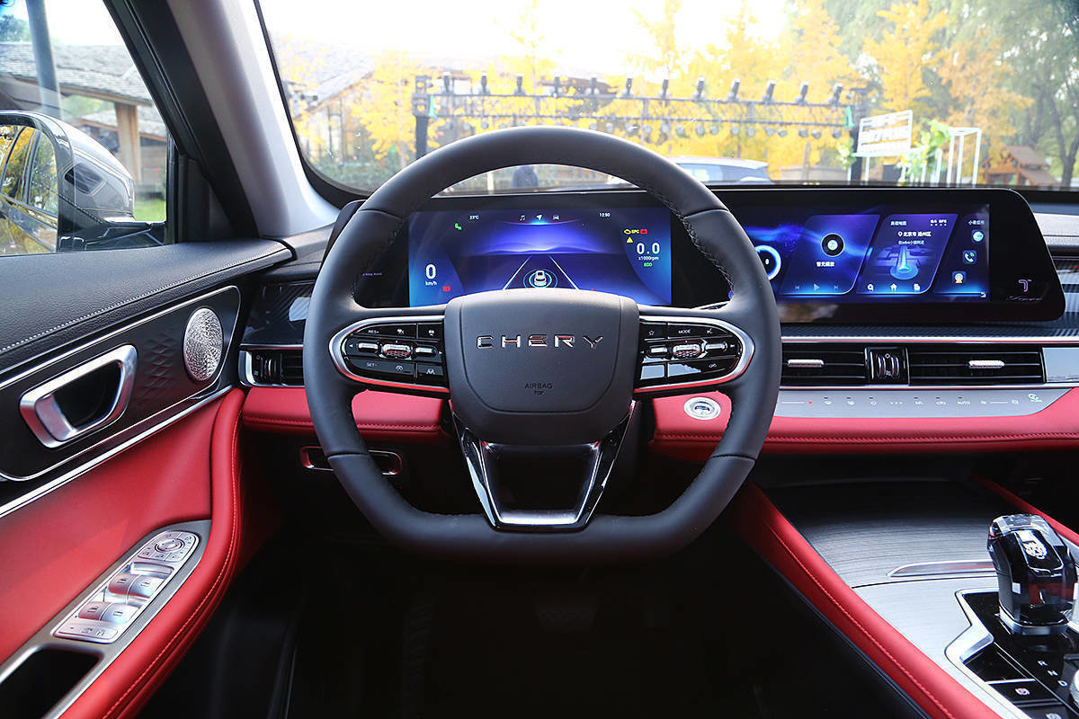 新款瑞虎7 PLUS采用的是三辐式的多动能平底方向盘,搭配以24.6英寸全液晶仪表盘与中控多媒体显示屏相连接的双连屏设计和电子换挡机构,在提升了座舱运动氛围的同时,也让车辆内部充满了科技感。