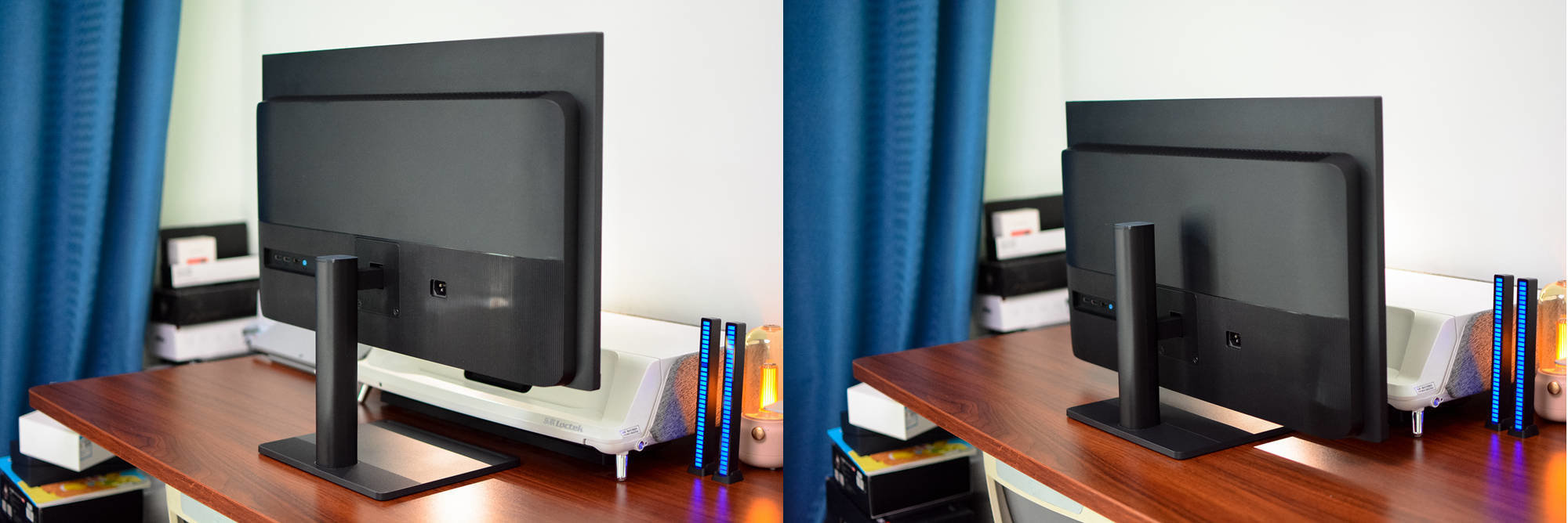 显示器支持上下滑动高度调节,这一点很便捷;不过受限于定位,支持小角度的前倾后仰,但不支持旋转。
