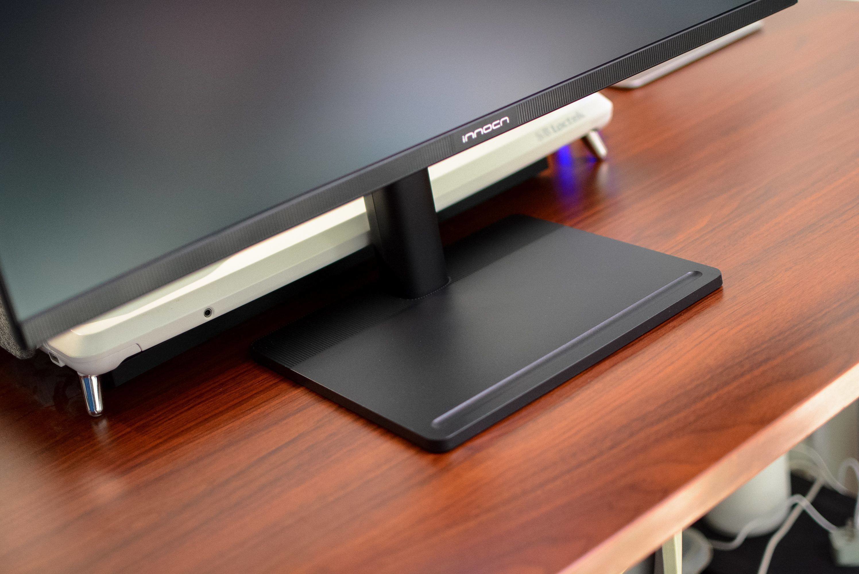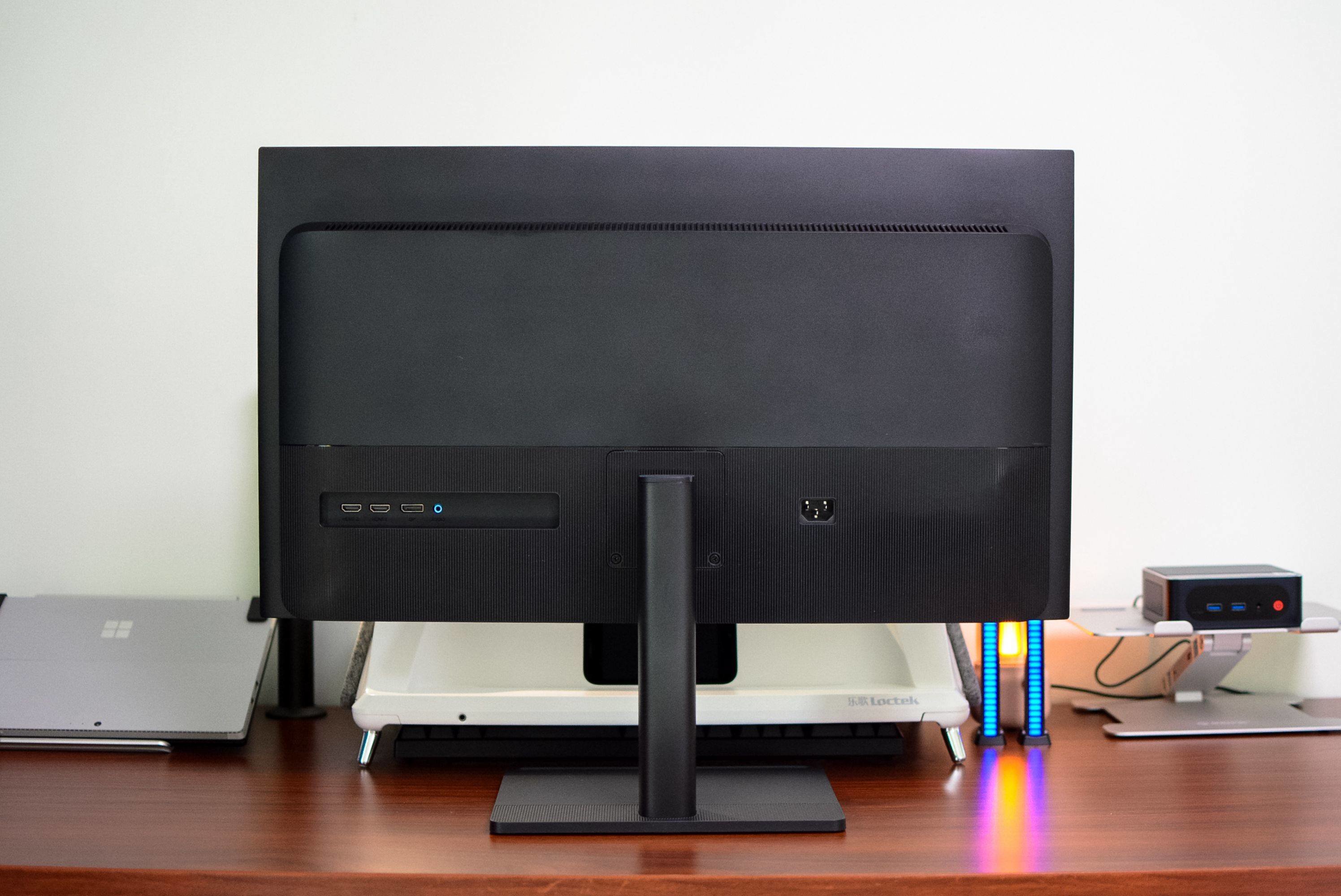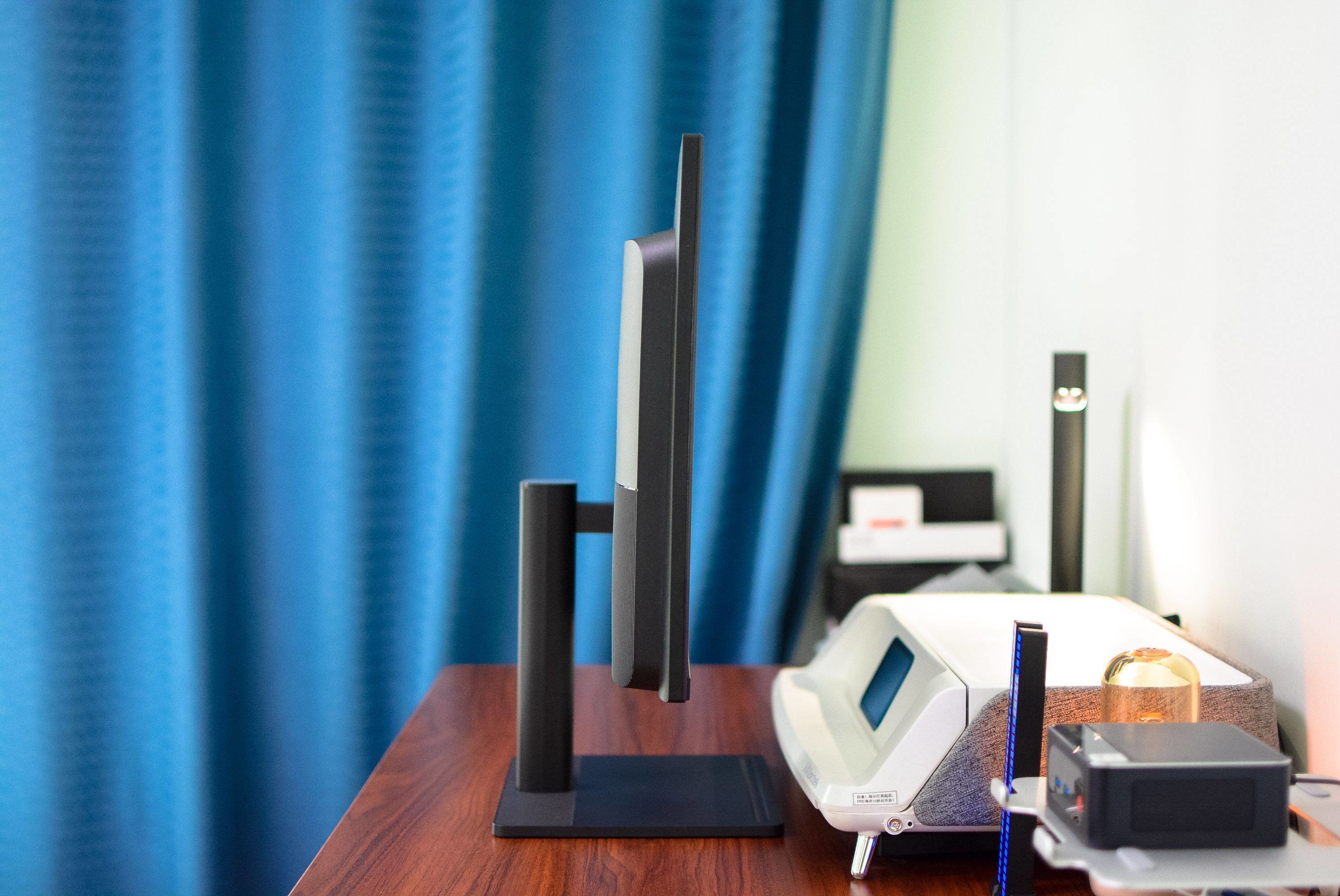 INNOCN 28D1U的整体比较轻薄,依靠着方形底座整体轮廓也极为清爽,对比目前很多显示器的三角形支架底座等设计,占用的桌面面积更小。