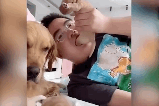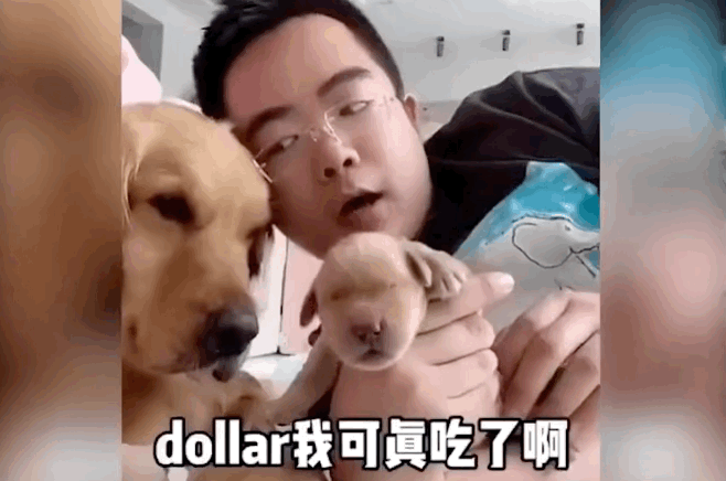 小奶狗实在太可爱了,网友经常拿在手里盘,有一次,他拿起最肉嘟嘟的一只,作势假装吃掉。