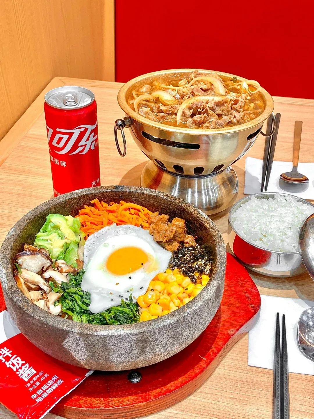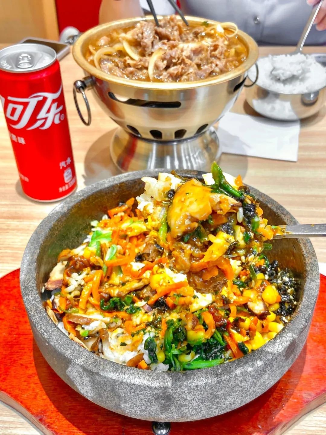 往米饭上堆满各种鲜蔬烤肉,便有了一碗色泽清新,口感酸辣的石锅拌饭。