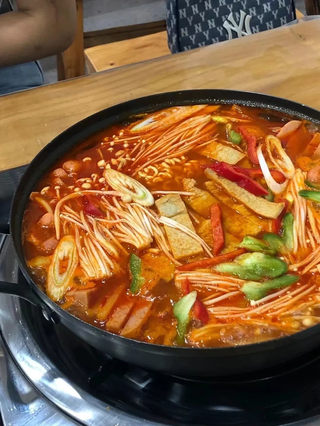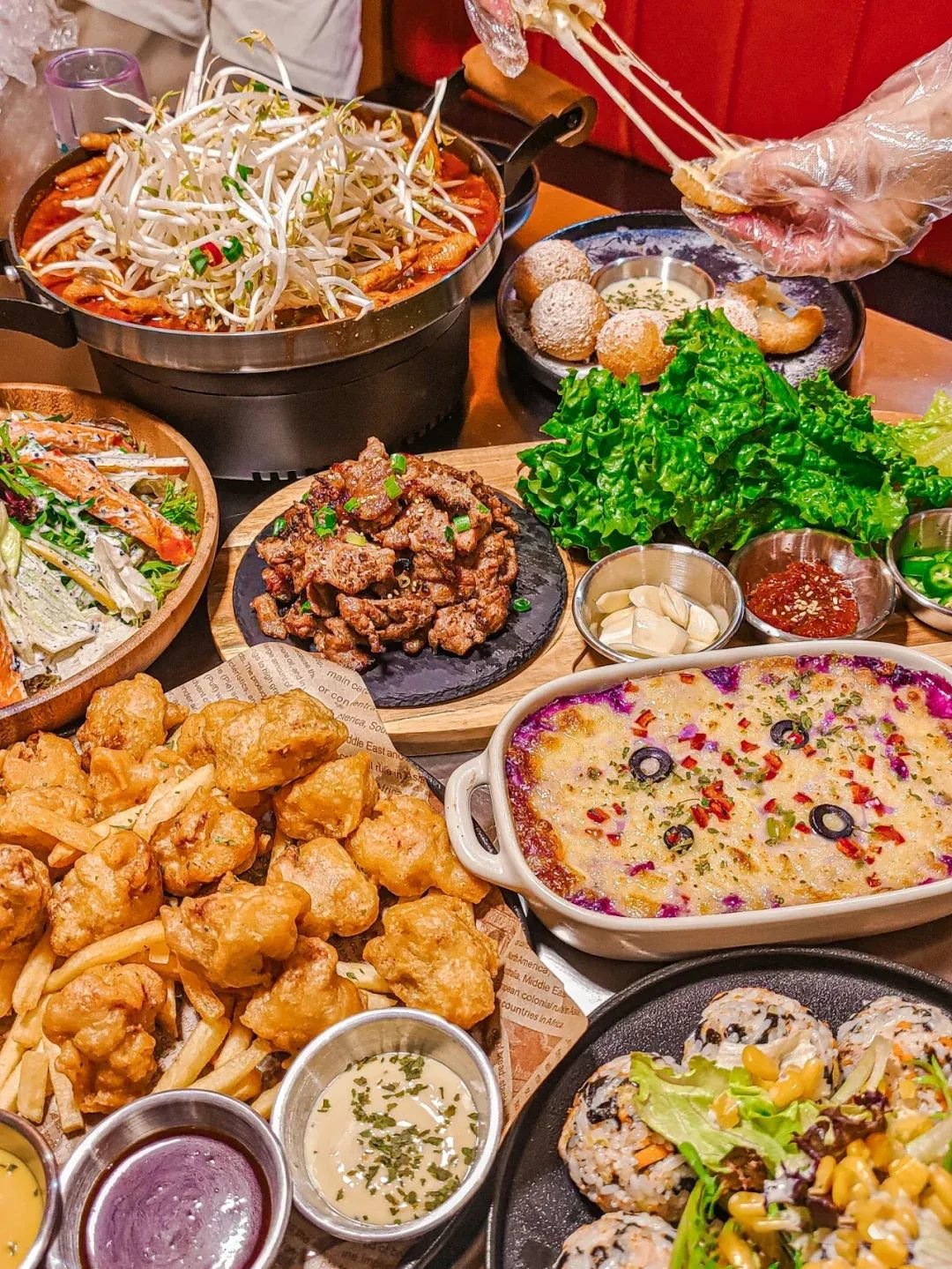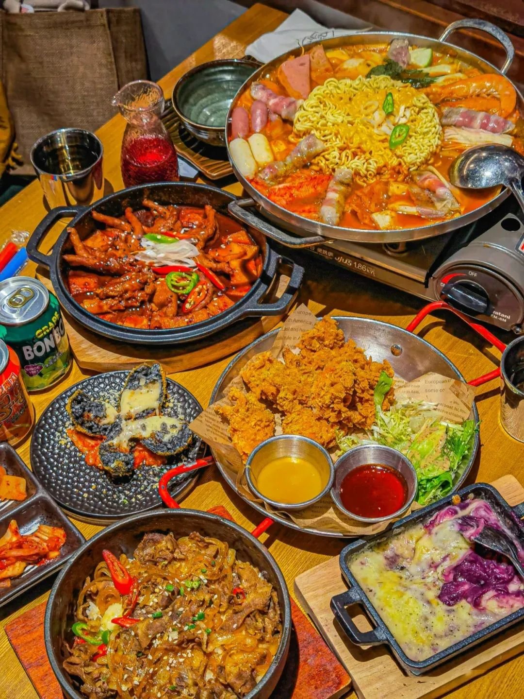 以酸辣的韩式酱汤打底,盖上厚厚的芝士粒,各种各样的蔬菜、牛肉、海鲜就在锅中沸腾翻滚……