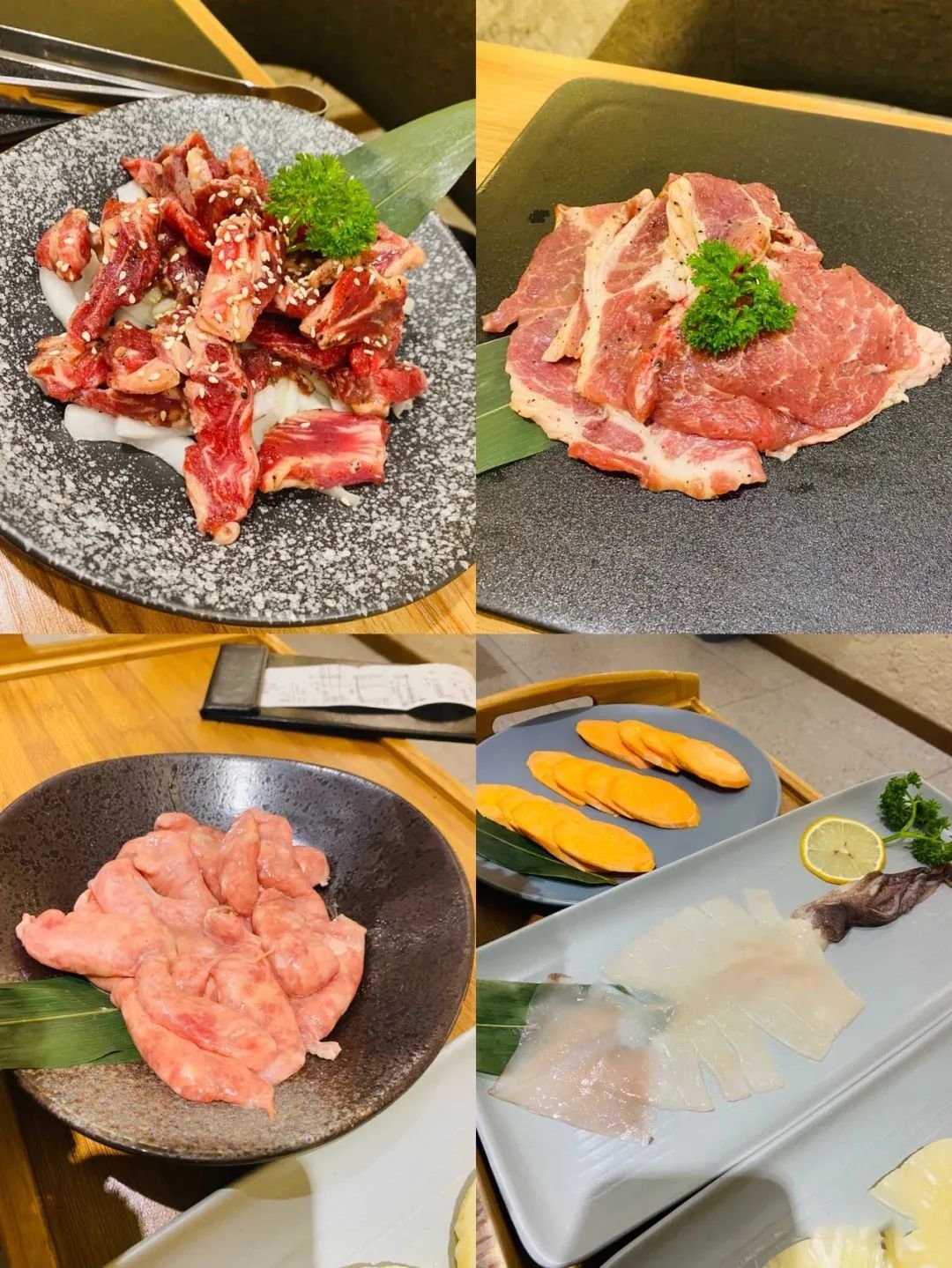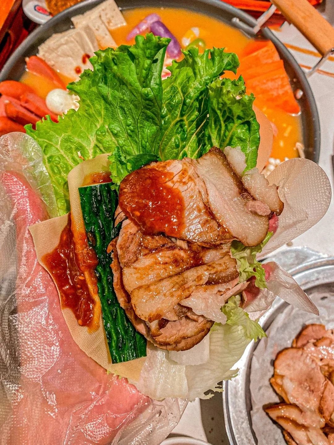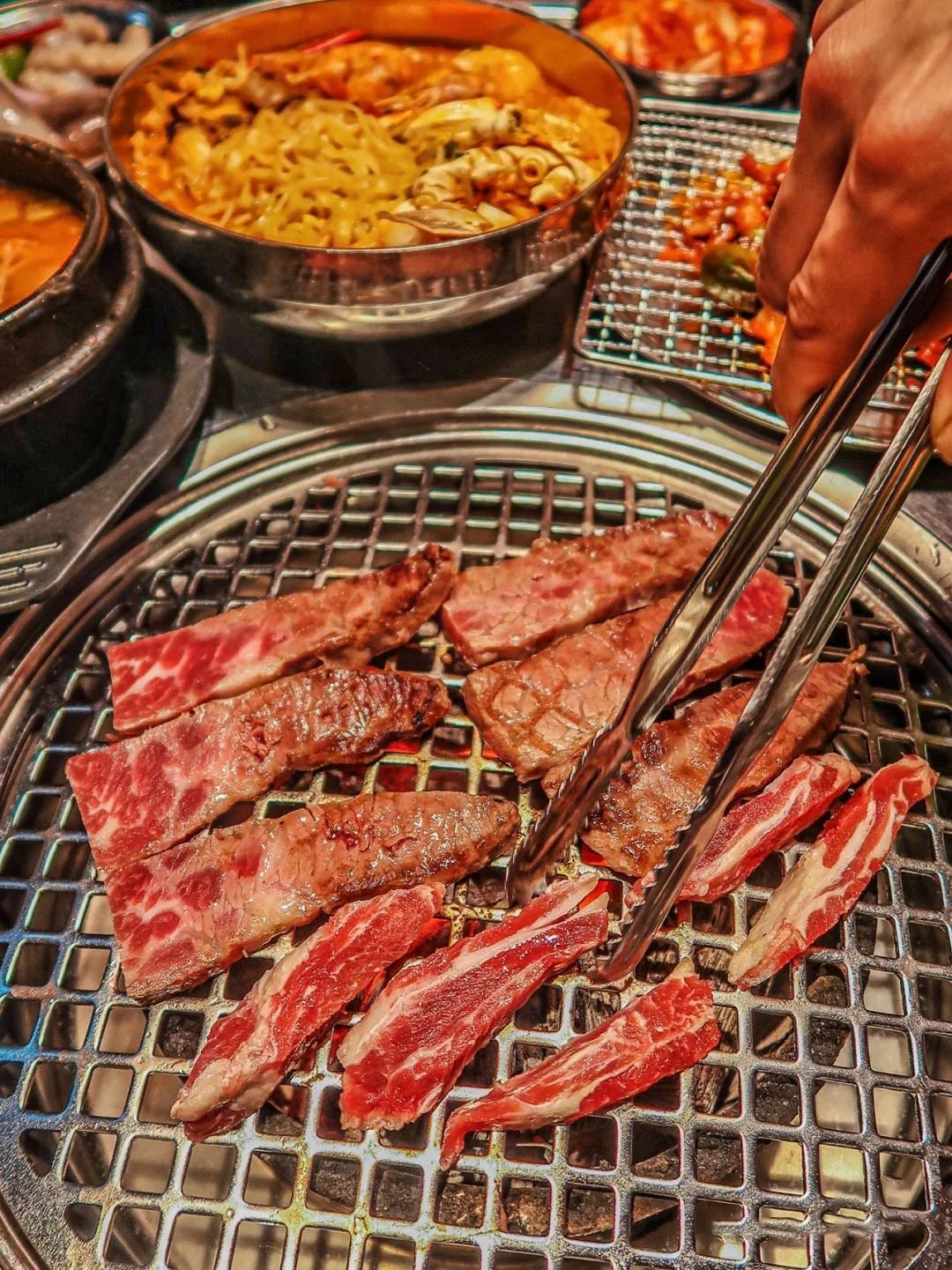 📍哇啦哇啦韩国料理和📍鲸炙烤肉可以一试,哇啦家的甜辣铁网烤猪肉是直接烤好的,酱调得很绝,包上紫苏叶就能吃,鲸炙家的肉品质很好,性价比高!