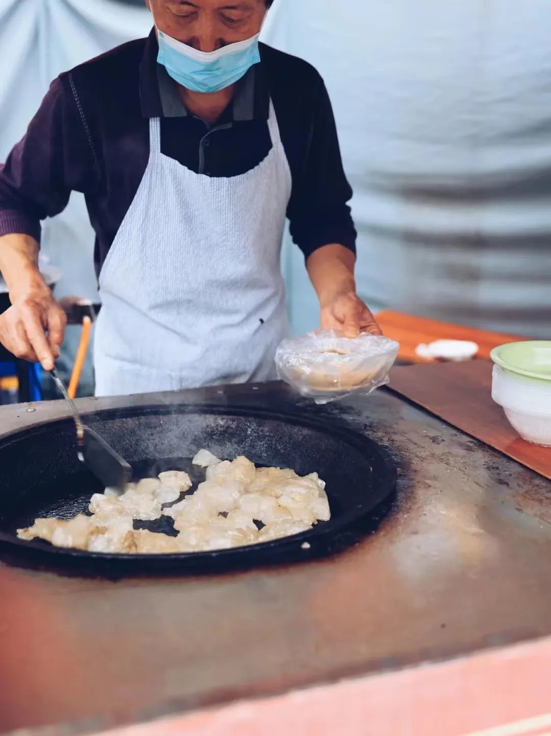 在小小的炉灶间,架一口平底煎锅,将地瓜粉制成的焖子往里一丢,煎至焦黄透明,便能勾得人口水直流。