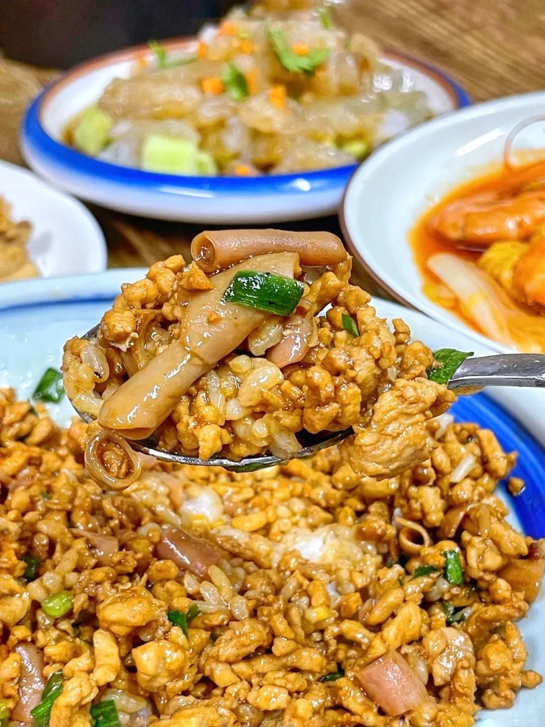 还可以做成风味十足的海肠捞饭,在米饭上淋上满满的海肠和汤汁,拌匀以后,米粒的软糯,海肠的脆韧,肉末的鲜香,一齐在口中迸发。