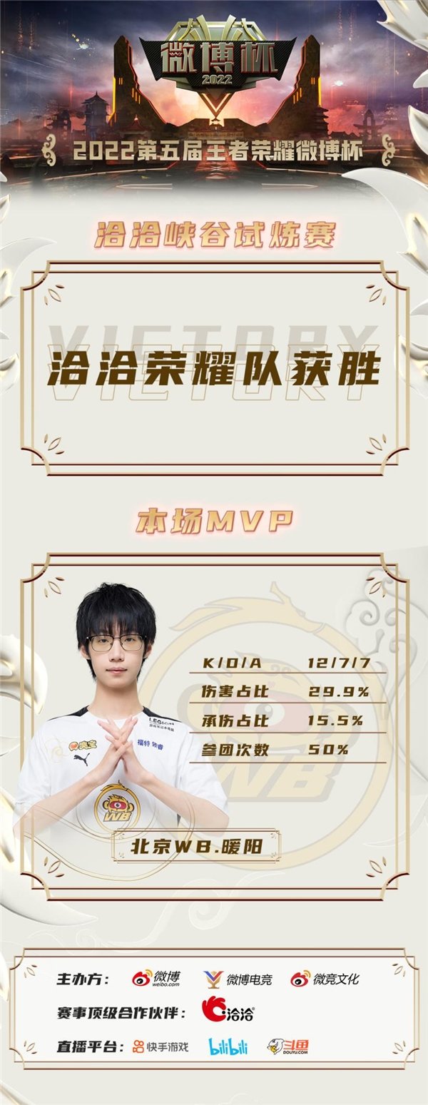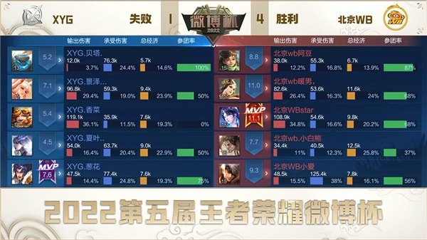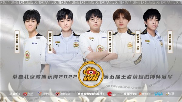 2022第五届王者荣耀微博杯,于2022年10月30日-11月6日期间进行,共计邀请8支来自KPL的顶尖战队。经过小组赛、淘汰赛的激烈对抗,北京WB最终不负粉丝与观众的期待,在总决赛与XYG成功会师。