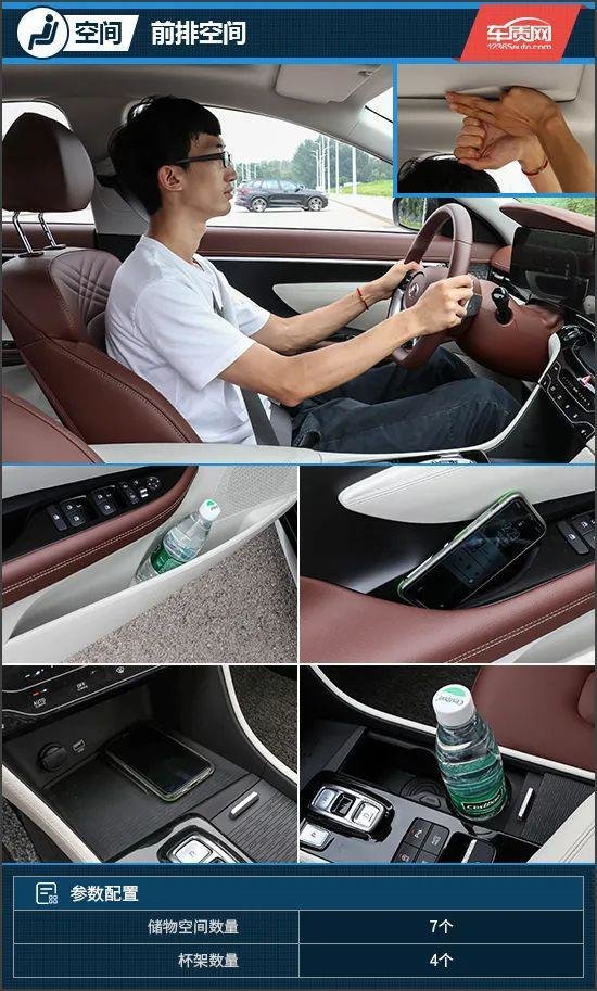 身高178cm的体验者坐进前排,头部空间一拳两指,横向与纵向空间充裕,乘坐体验舒适。储物空间方面,储物槽数量和容积均表现不错,前车门板储物槽预留了杯架位,前排杯架还采用了折叠式设计,可以在储物槽和杯架之间自由切换。此外,由于此次试驾的为顶配车型,因此前排储物槽内还提供了无线充电功能。