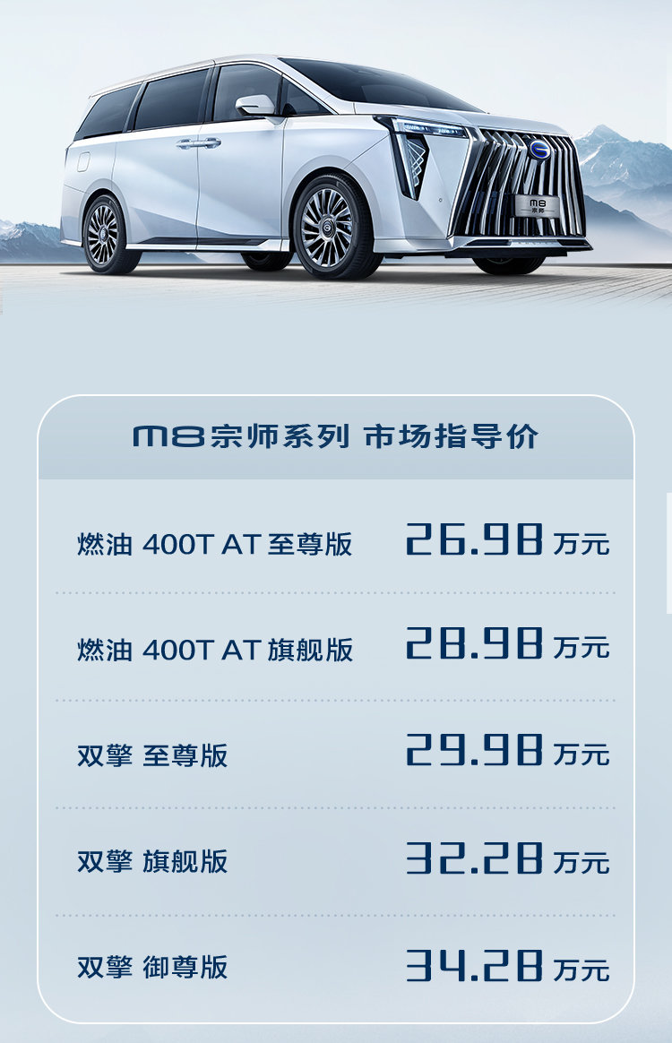 2022年11月8日晚,广汽传祺宣布,旗下的传祺M8宗师版正式上市,其定位在传祺M8大师版至上,主打30万元以上市场。其售价区间为26.98万至34.28万元,共推出五款车型,其中两款燃油版车型,三款混动版车型。