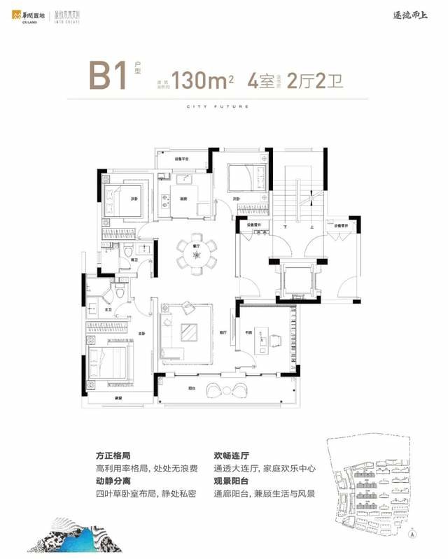 润樾山名邸均价约3.05万/㎡,你的预算最多能买到130㎡户型,4房2卫,三开间朝南,户型中规中矩。