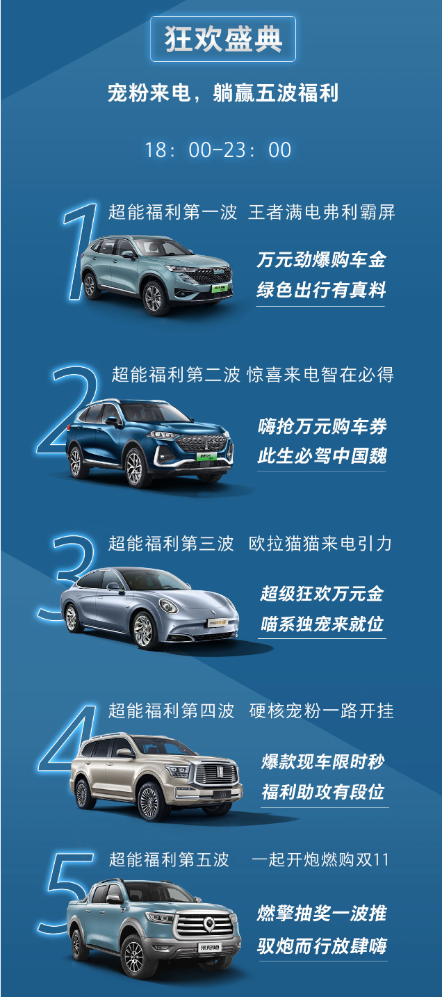 这个活动之所以热度非凡,是因为长城汽车的诚意十足!双11的活动,长城汽车居然可以持续1个月你敢信?从11月1日到30日,长城汽车五大品牌、线下终端经销店联动,派发百万超级补贴与万套精美礼品。马上到来的10号“狂欢盛典”更是会将福利直接拉满!