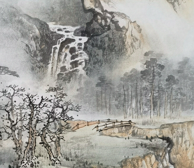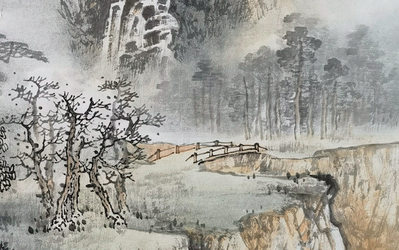 溪水可谓是全图的脊梁骨,湍急的溪流为静止的山、柔和的云注入了几分灵气。