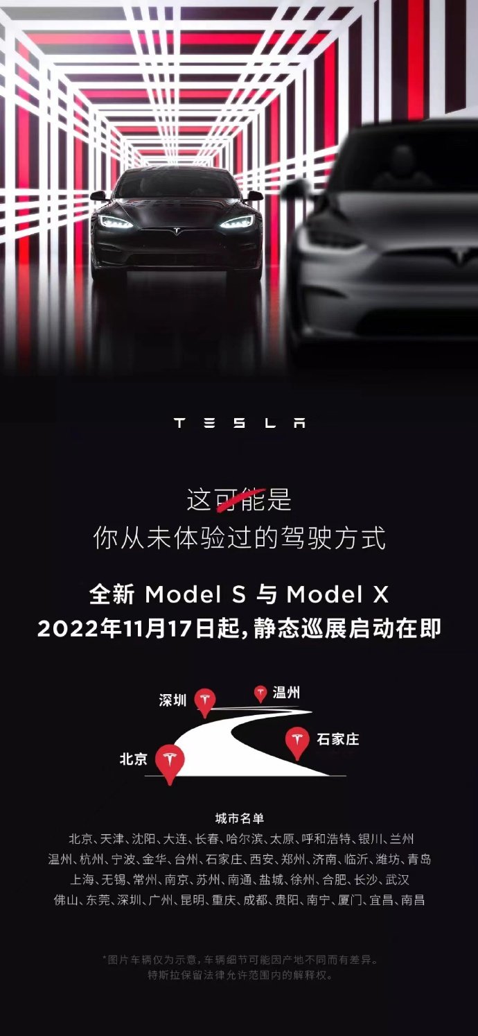 IT之家 11 月 8 日消息,特斯拉官方宣布,全新 Model S 与 Model X 全国静态巡展即将开启,“这可能是你从未体验过的驾驶方式”,11 月 17 日,敬请期待!