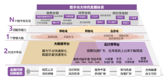 在未来“金融+科技”融合生态发展中,云计算是支撑银行场景及生态的底层技术。中国光大银行顺应数字经济时代的要求,确立了“123+N”数字化银行发展体系,即“一个智慧大脑+两大技术平台+三项服务能力+N个数字化名品”。其中,两大技术平台就指的云计算平台和大数据平台,是支撑整个光大数字化战略的底座。