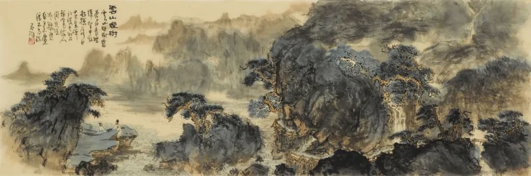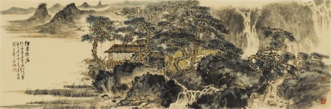 古木阴中系短蓬,仗黎扶我过桥东,先生常常喜画一位道骨仙风的长者,或策仗访友,或观瀑,或听琴,或临窗读易,亦或是闲翘二郎腿卧于山坡,恣意山水之间,估计这也是先生自己的写照,一片山水就是心灵的境界,一片性灵栖息的世界,也是他为心灵找到的安身之所。