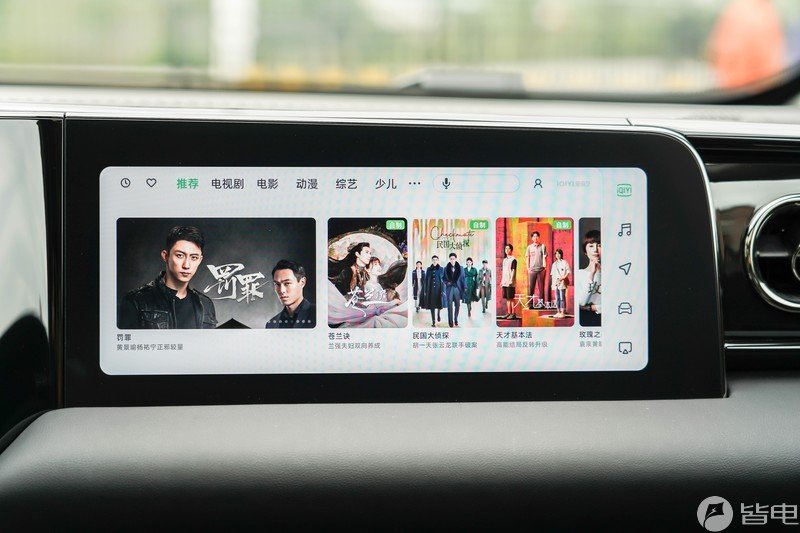 副驾娱乐屏的UI设计同样简介,固定栏被放置在右侧,从上到下分别是爱奇艺、音乐、地图、设置和投屏。