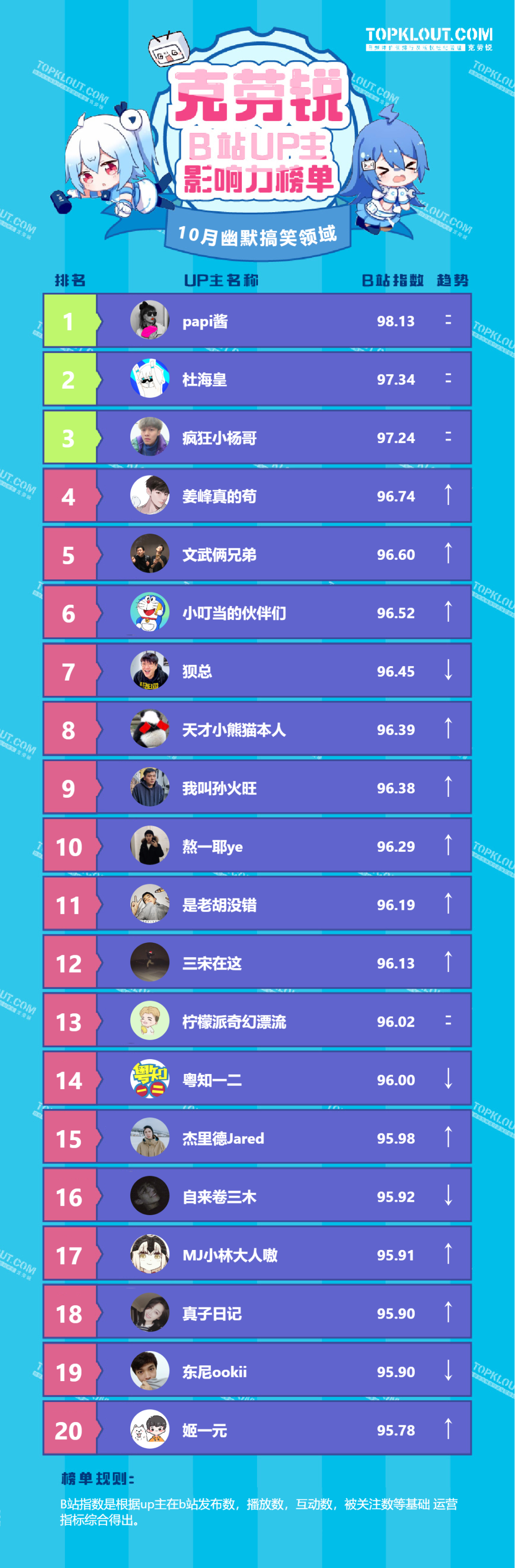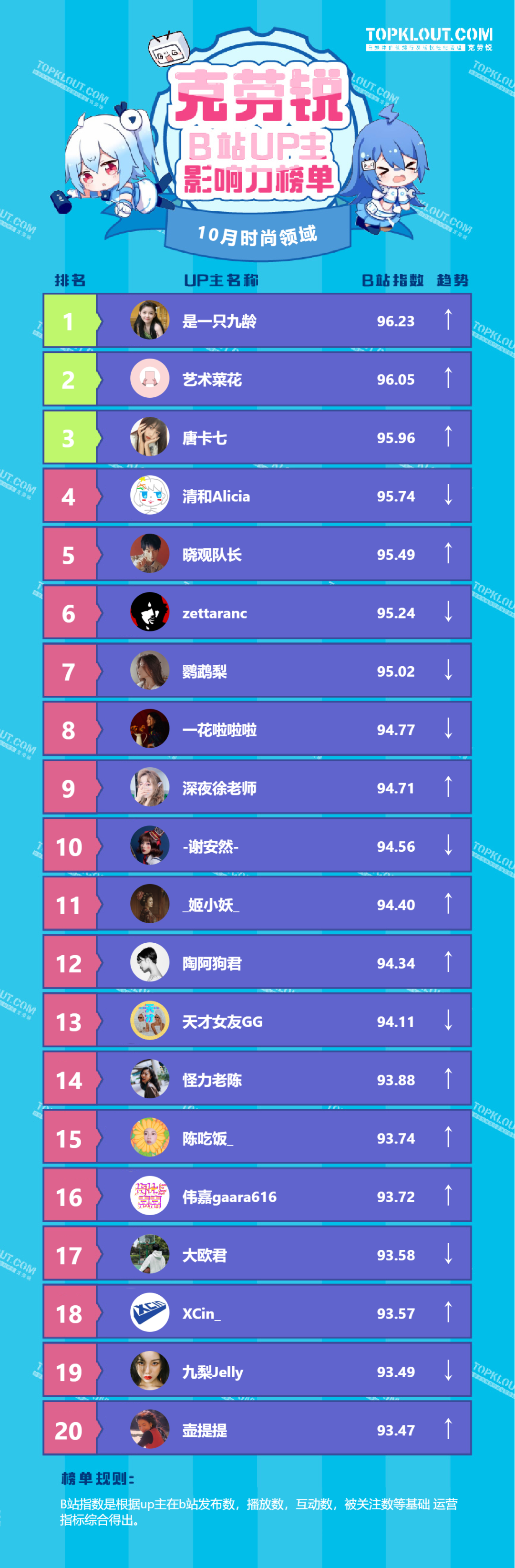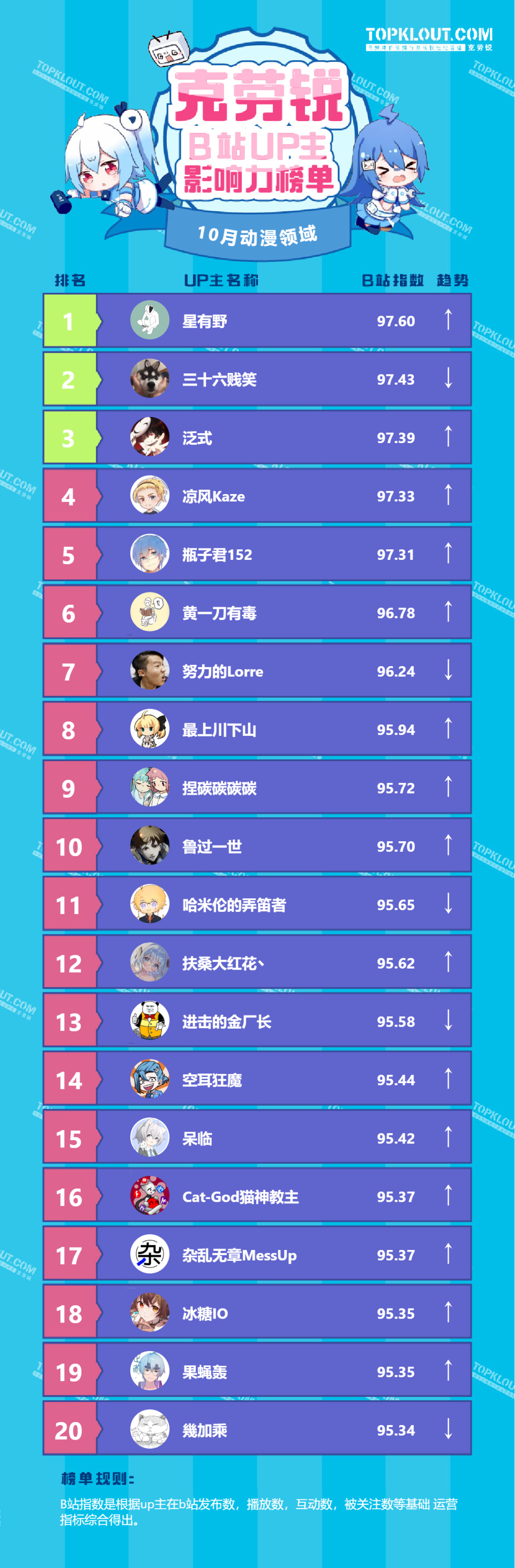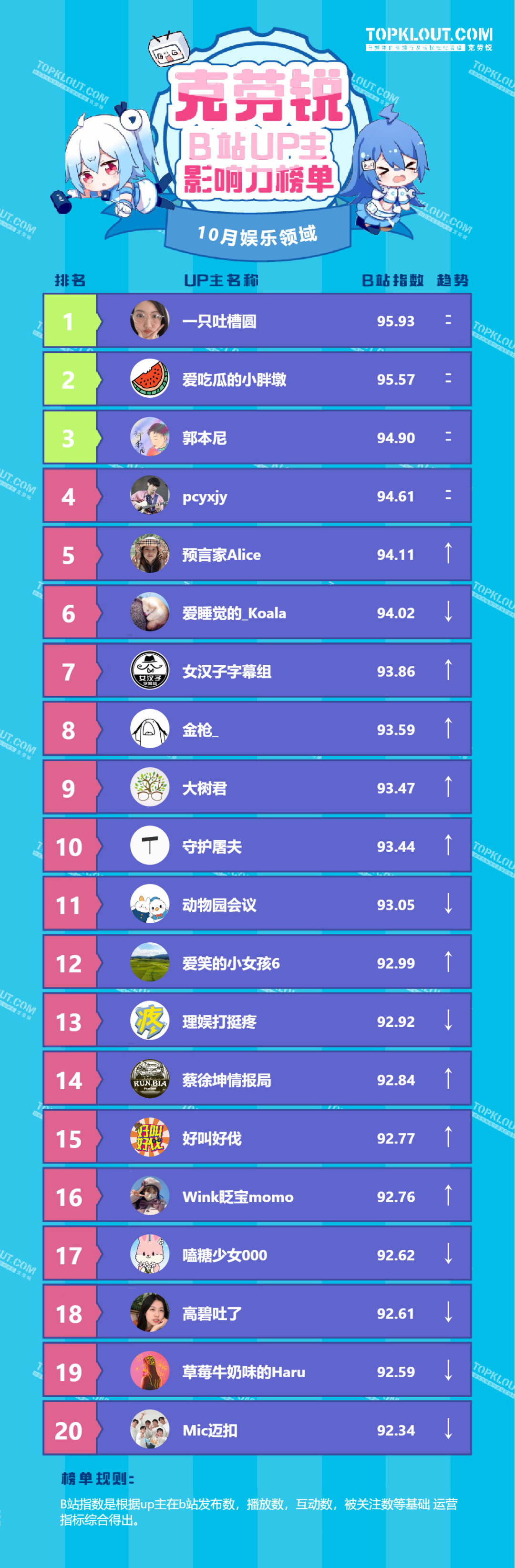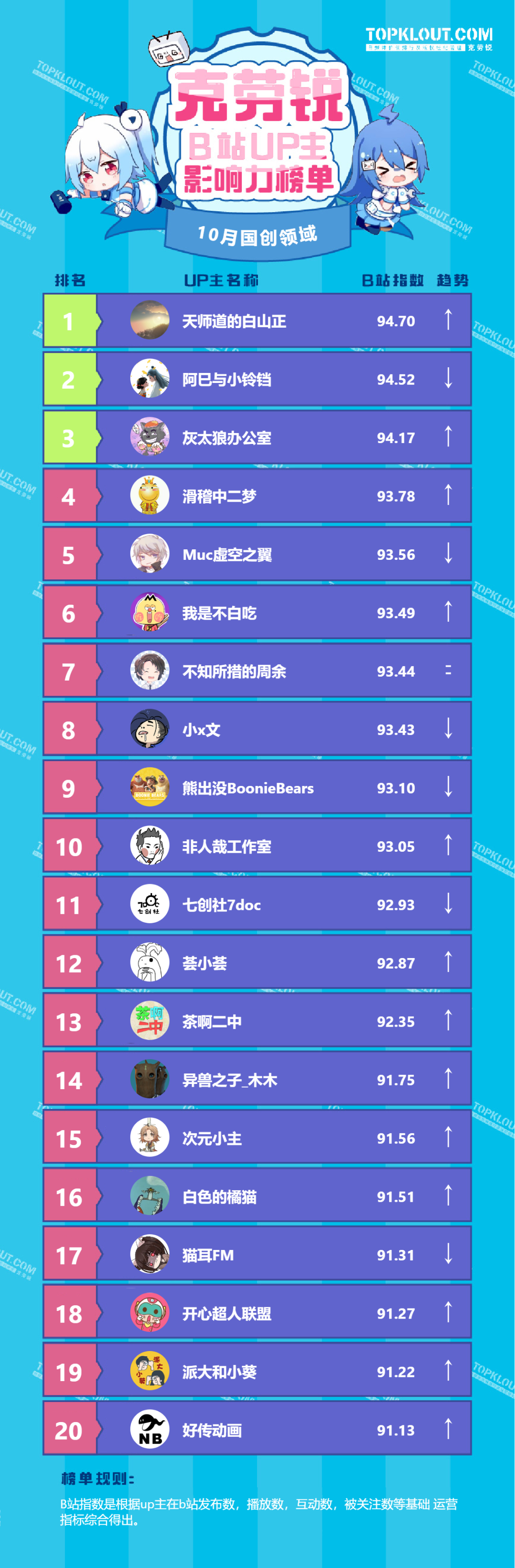 各垂类头部UP主排名依据的是“B站指数”。B站指数是根据每位UP主的内容发布量、播放量、转发量、评论量、收藏量、点赞量、关注量共七个维度综合计算得出的,是客观反映UP主的影响力及营销价值的重要指标。我们来一起看看10月榜单吧!
