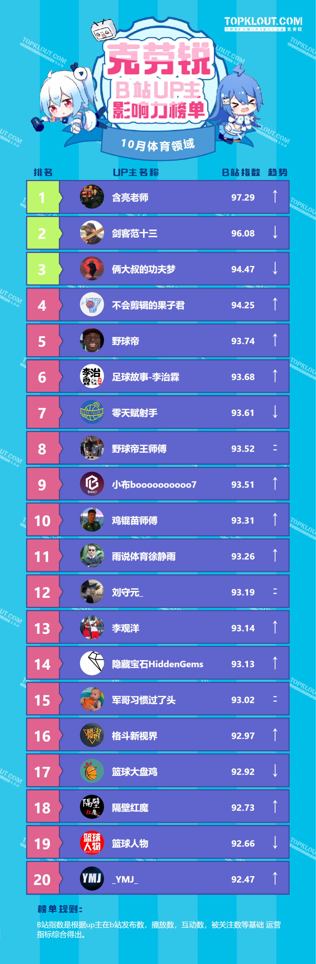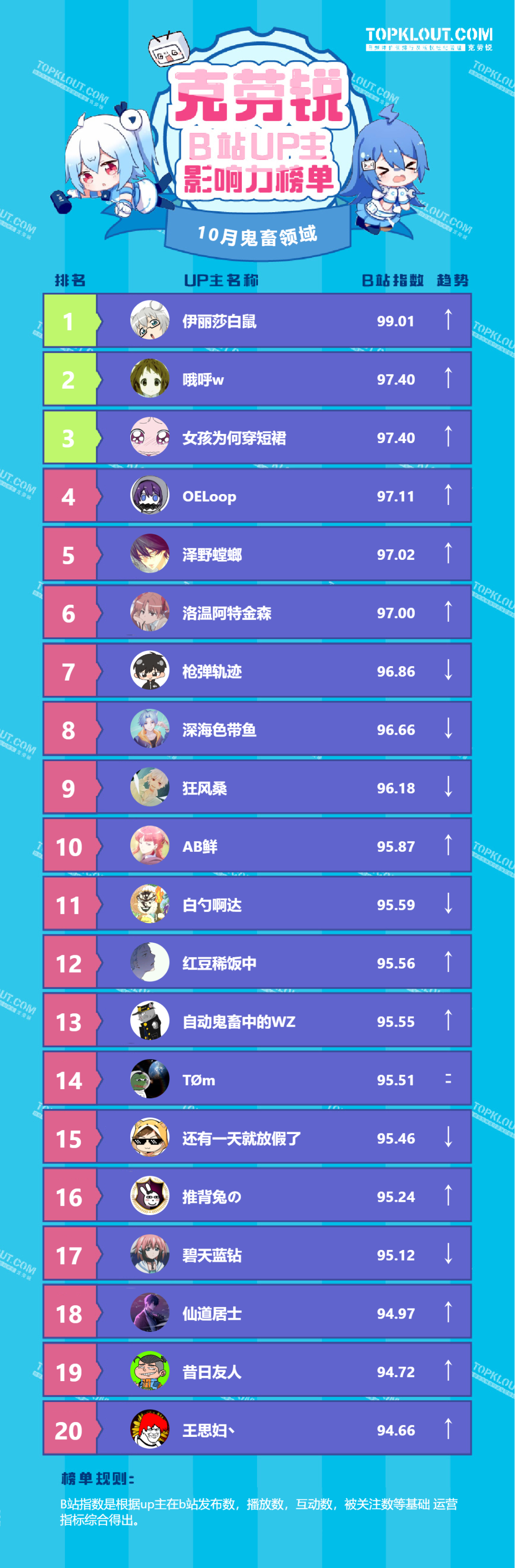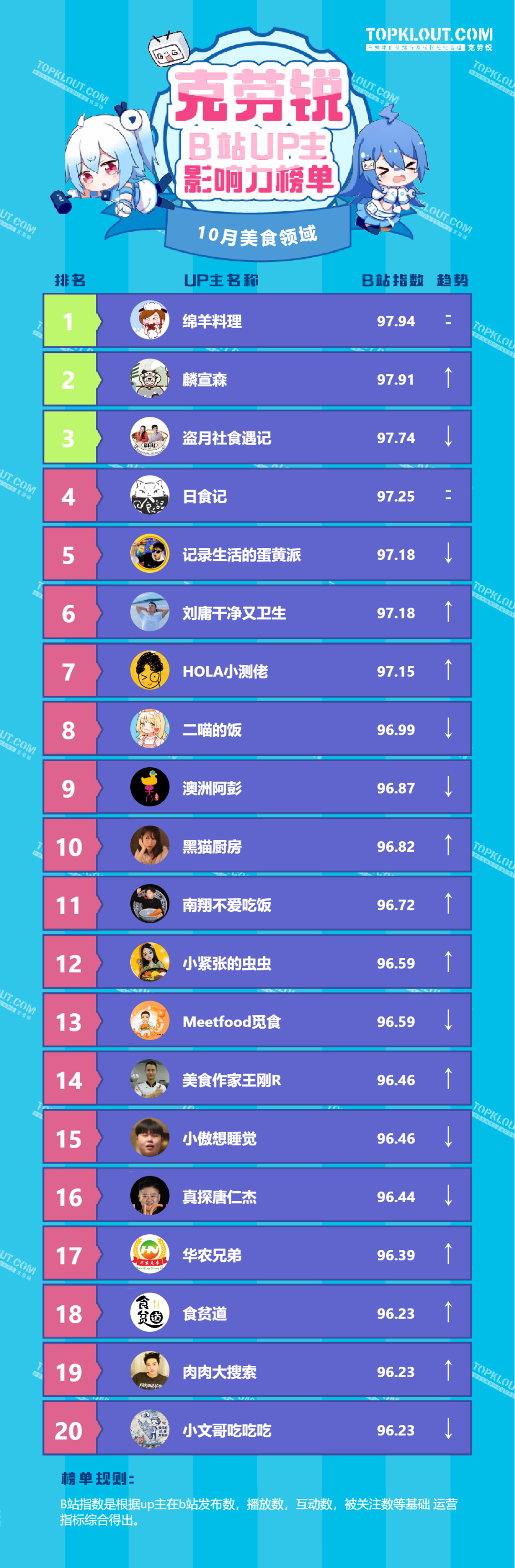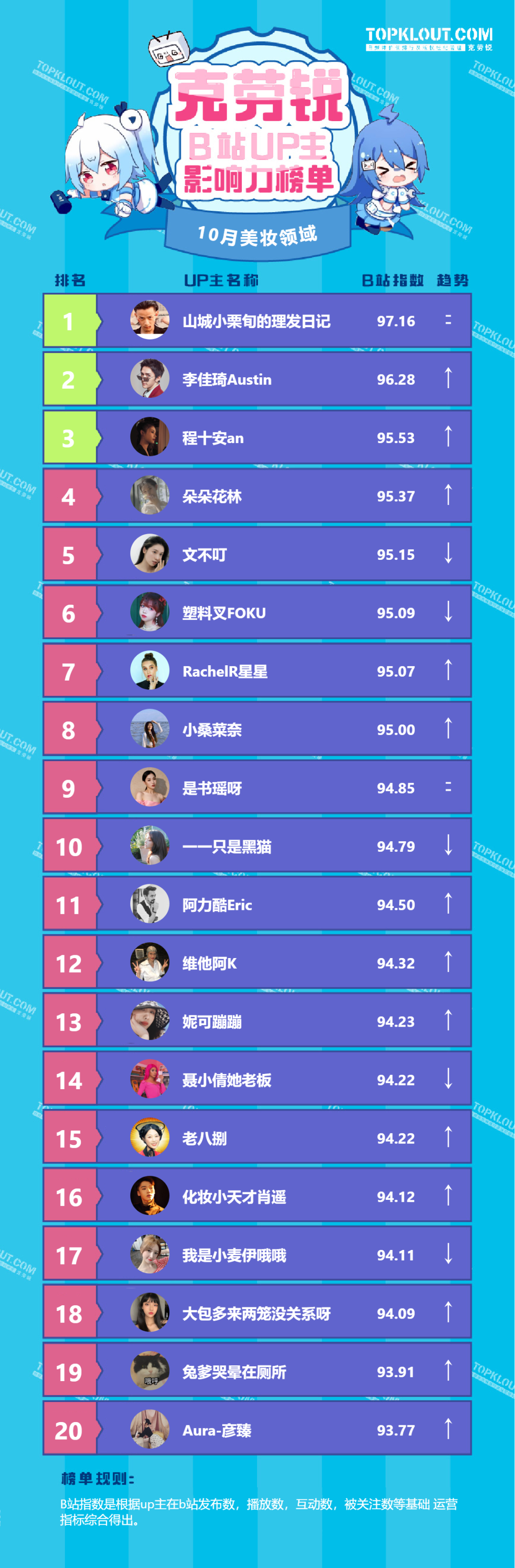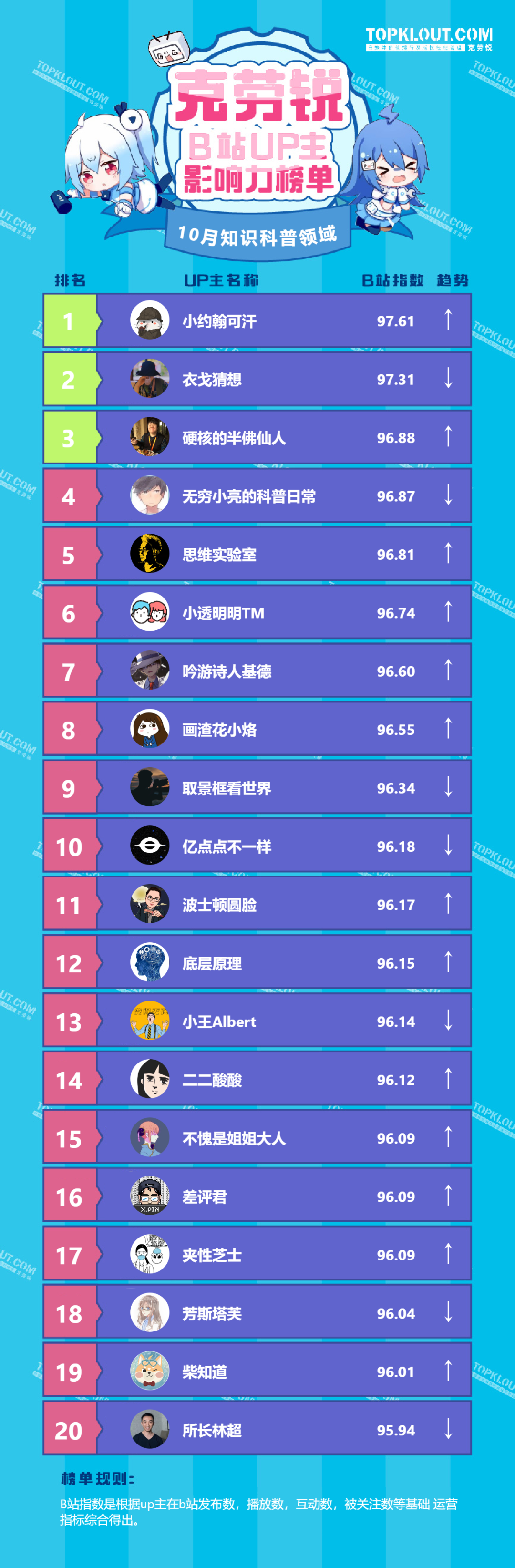 各垂类头部UP主排名依据的是“B站指数”。B站指数是根据每位UP主的内容发布量、播放量、转发量、评论量、收藏量、点赞量、关注量共七个维度综合计算得出的,是客观反映UP主的影响力及营销价值的重要指标。我们来一起看看10月榜单吧!