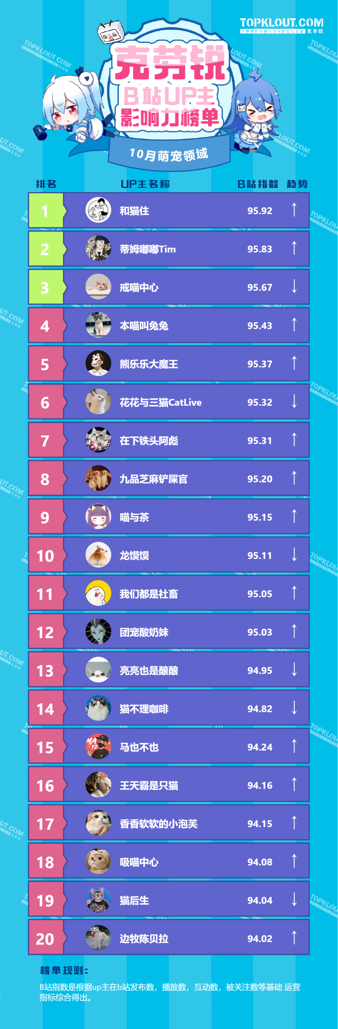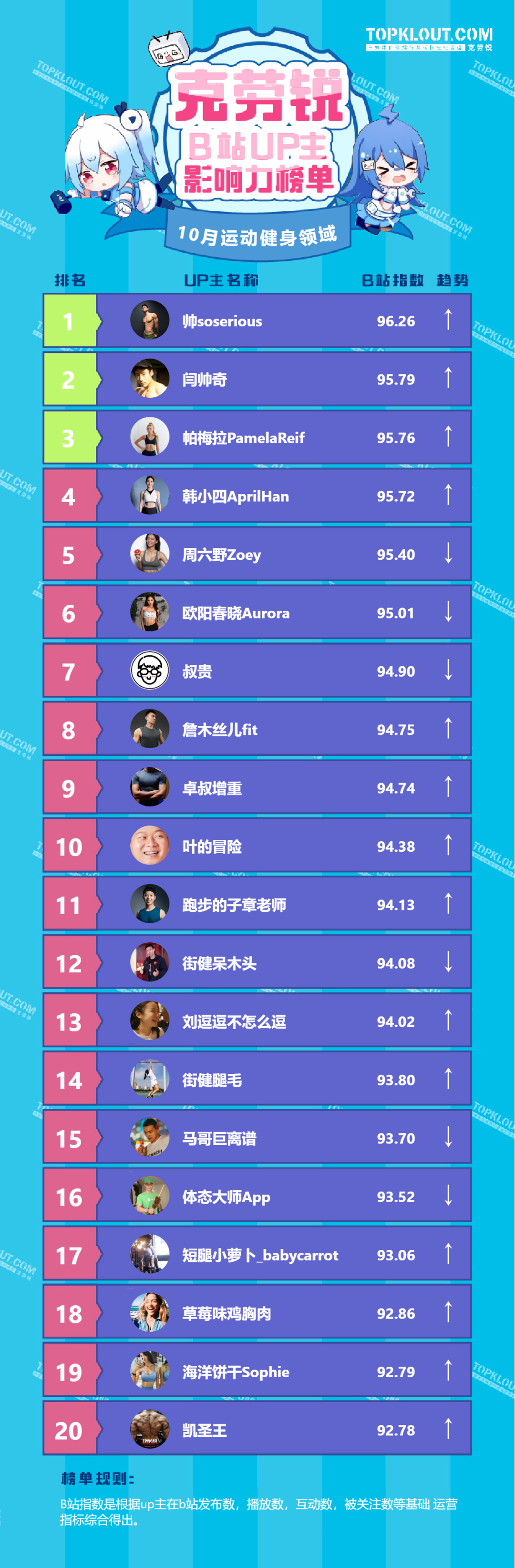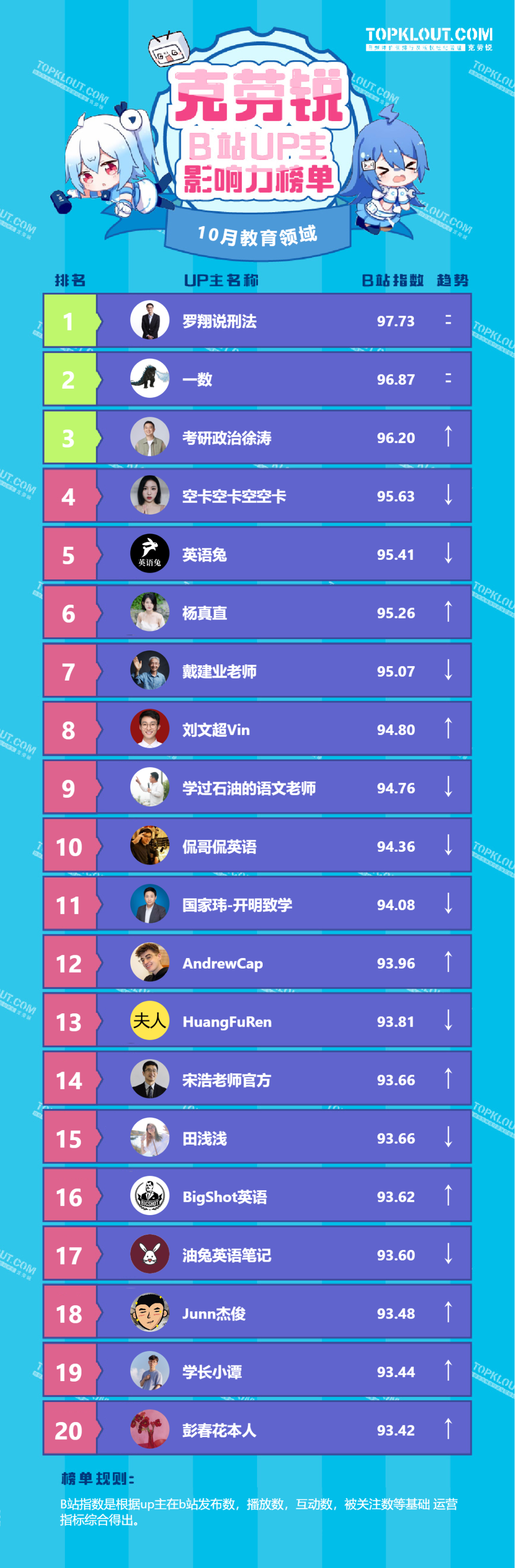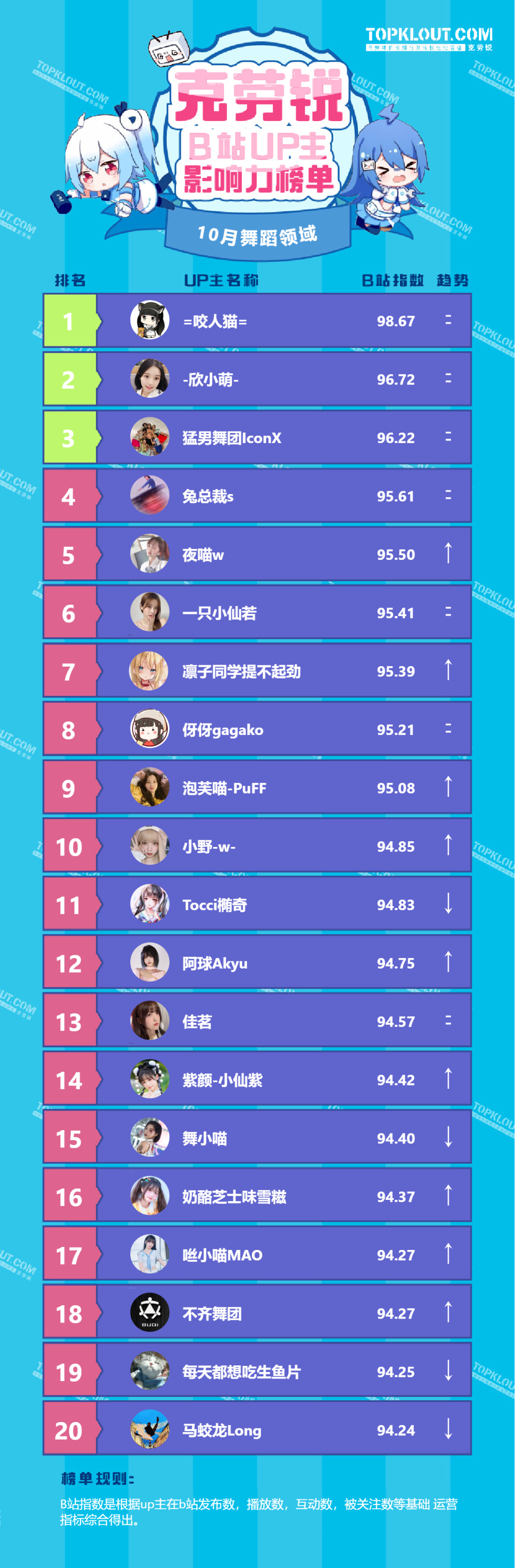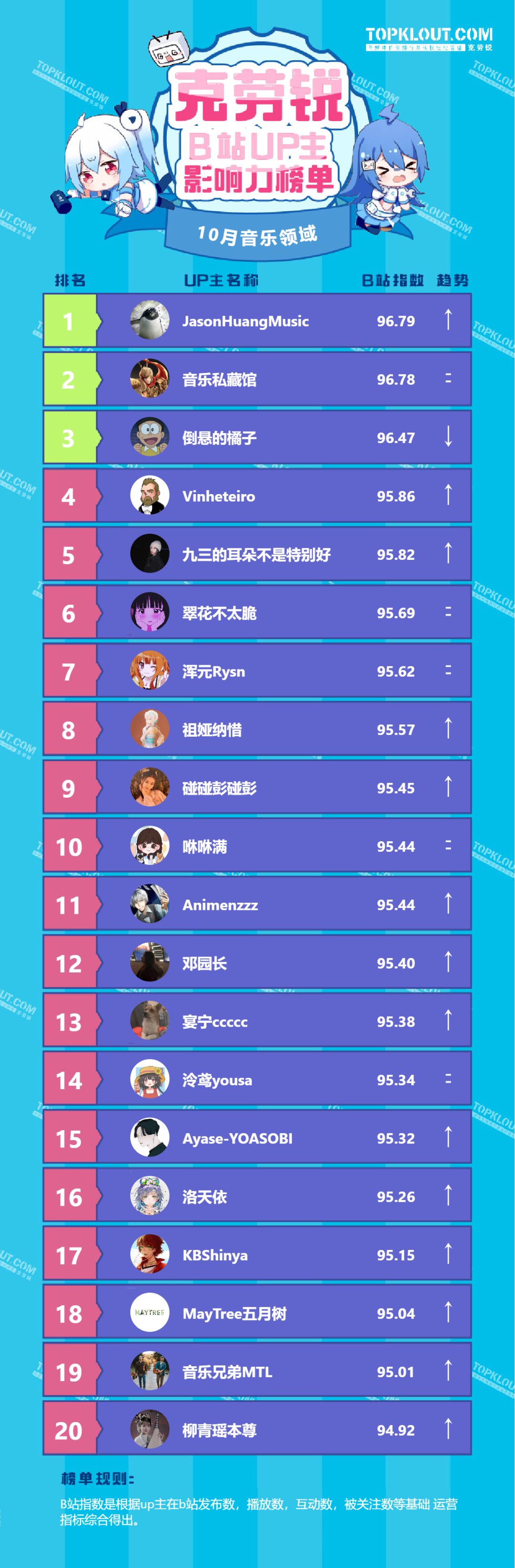 各垂类头部UP主排名依据的是“B站指数”。B站指数是根据每位UP主的内容发布量、播放量、转发量、评论量、收藏量、点赞量、关注量共七个维度综合计算得出的,是客观反映UP主的影响力及营销价值的重要指标。我们来一起看看10月榜单吧!