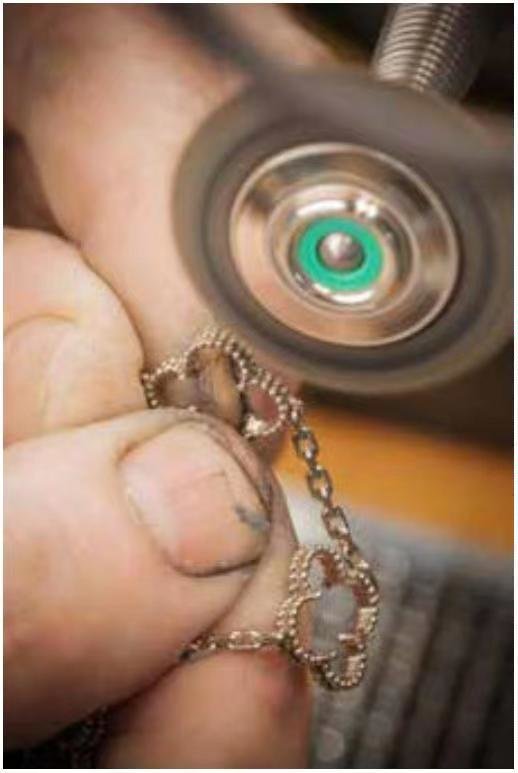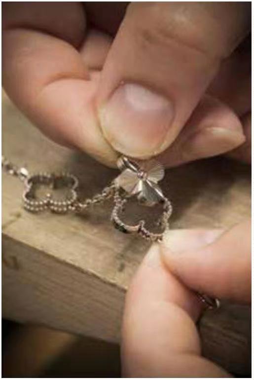 珍贵的圆珠饰边由大师级珠宝工匠悉心润饰,再将磨圆的镶爪弯曲,以承托四叶幸 运图案,为作品增添柔和的氛围。最后的抛光工序为作品锦上添花,绽放美不胜收的 璀璨流光。每件Alhambra系列作品经过不少于15道工序,包括选材、精铸及质检,方 能成就隽永不朽的传世佳作。