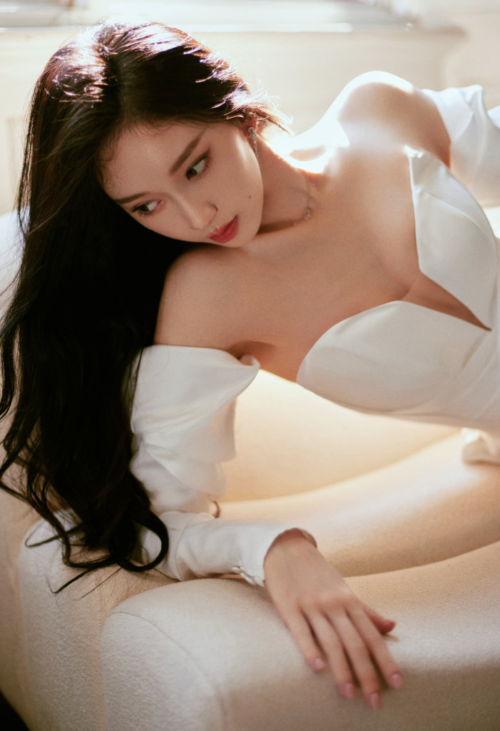 刘令姿纯白拖地长裙写真 长发微卷又纯又欲