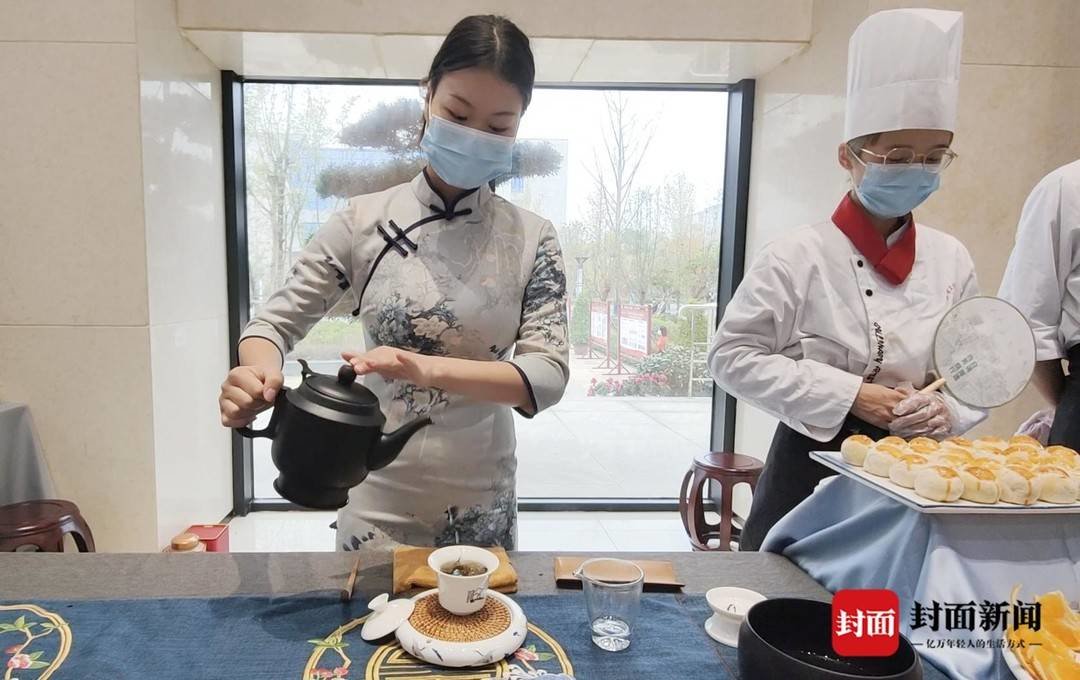 会场外,非物质文化遗产工作室、导游讲解练习亭、导游实战演练沙盘实训室,学生们正在学习各类专业技能。茶艺、面点、咖啡等现场制作,也吸引宾客驻足关注。