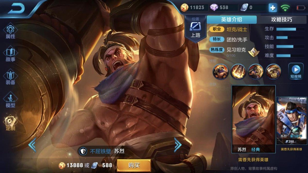 苏烈从英雄强度上来说,中规中矩,各项数值不错,不过苏烈有强开团的能力,而且在前期有一定的骚扰对面野区打野的能力,所以真要选择苏烈辅助,最好还是要看阵容选择。下面我们来说一下苏烈的具体玩法,这个版本选出苏烈,其实就是欺负对面弱势打野,因为新赛季增加了野区保护,所以一般很难进行反野,但苏烈可以用技能把原本对面打的野顶出来,让野怪脱离仇恨,拖慢对面打野的节奏。