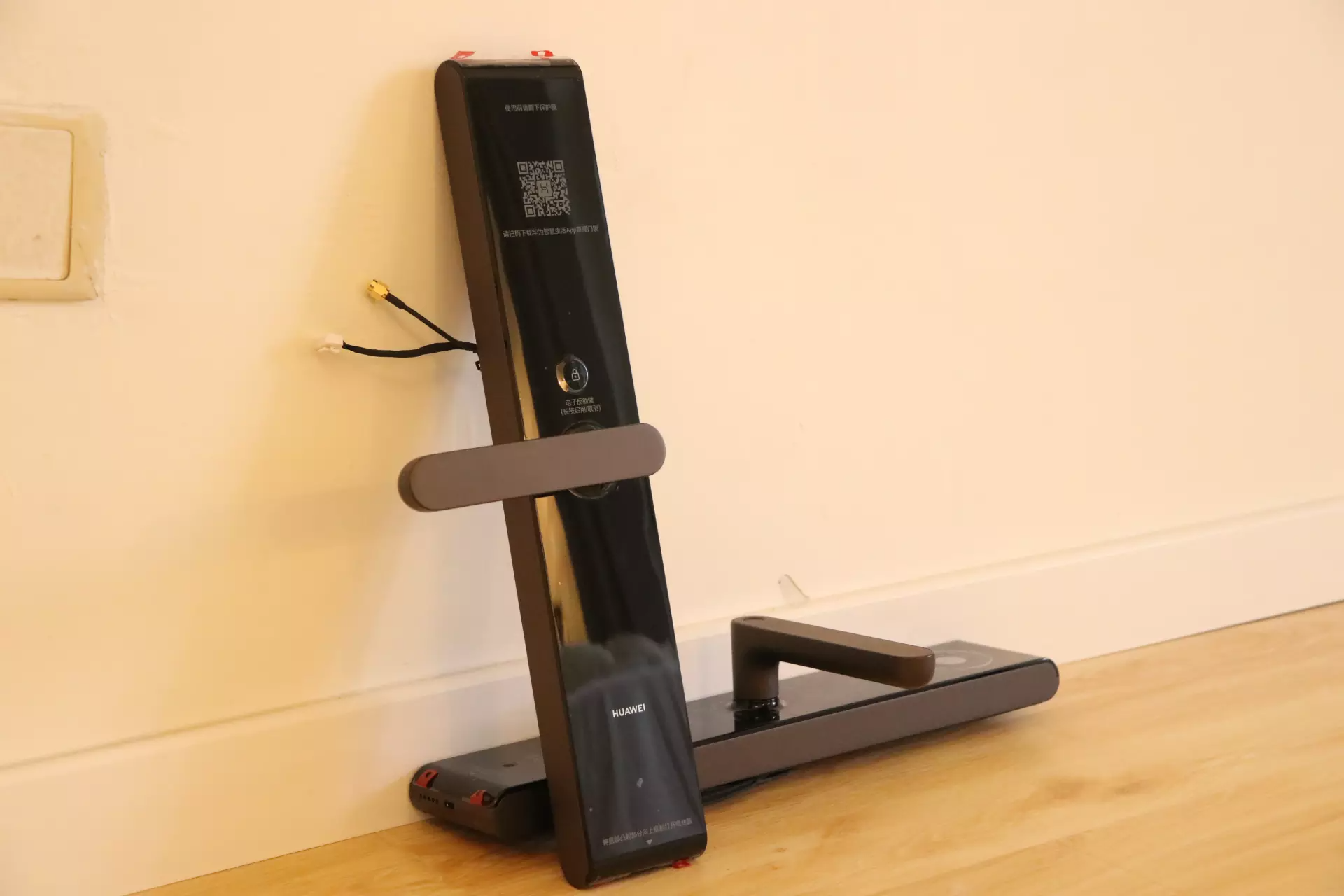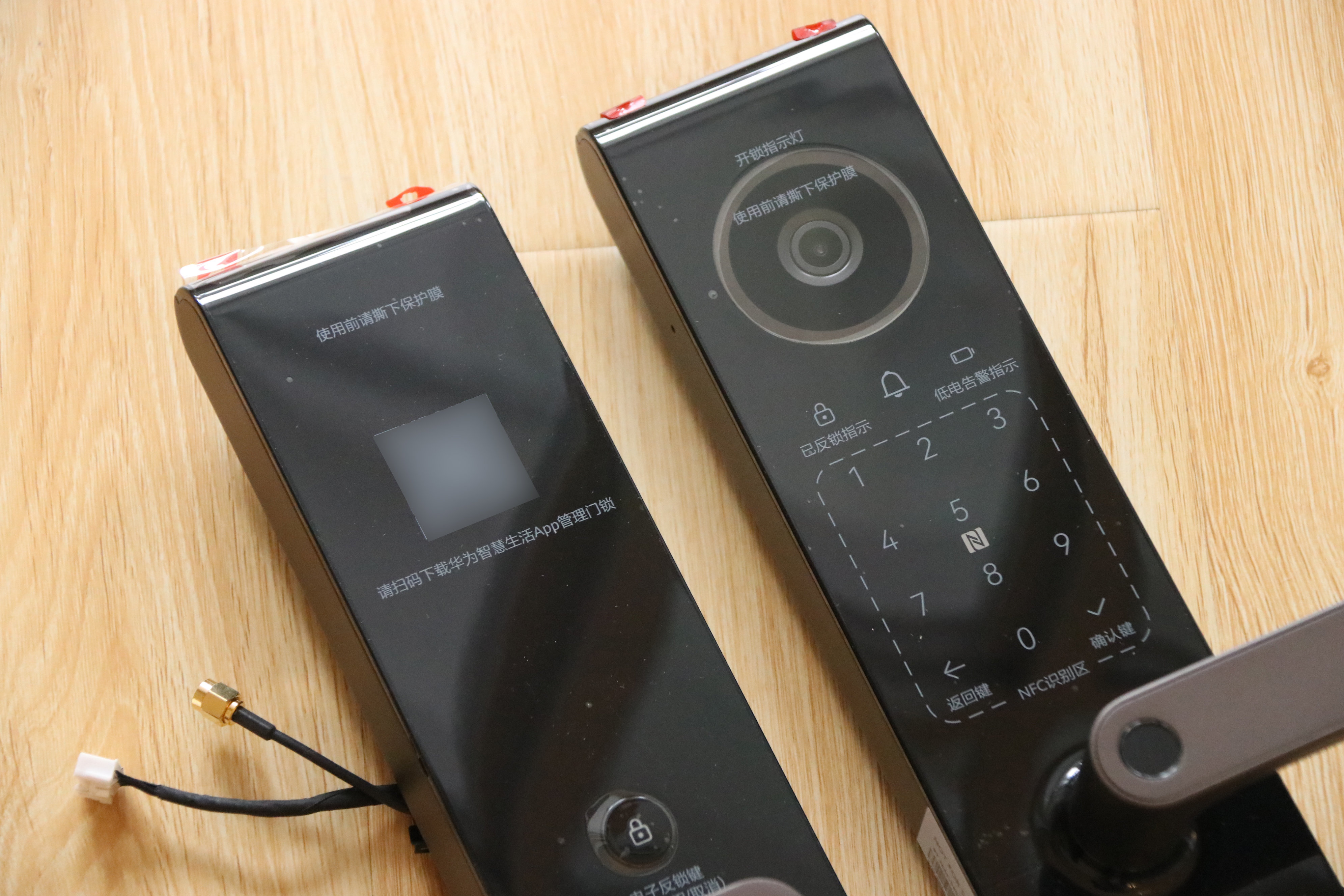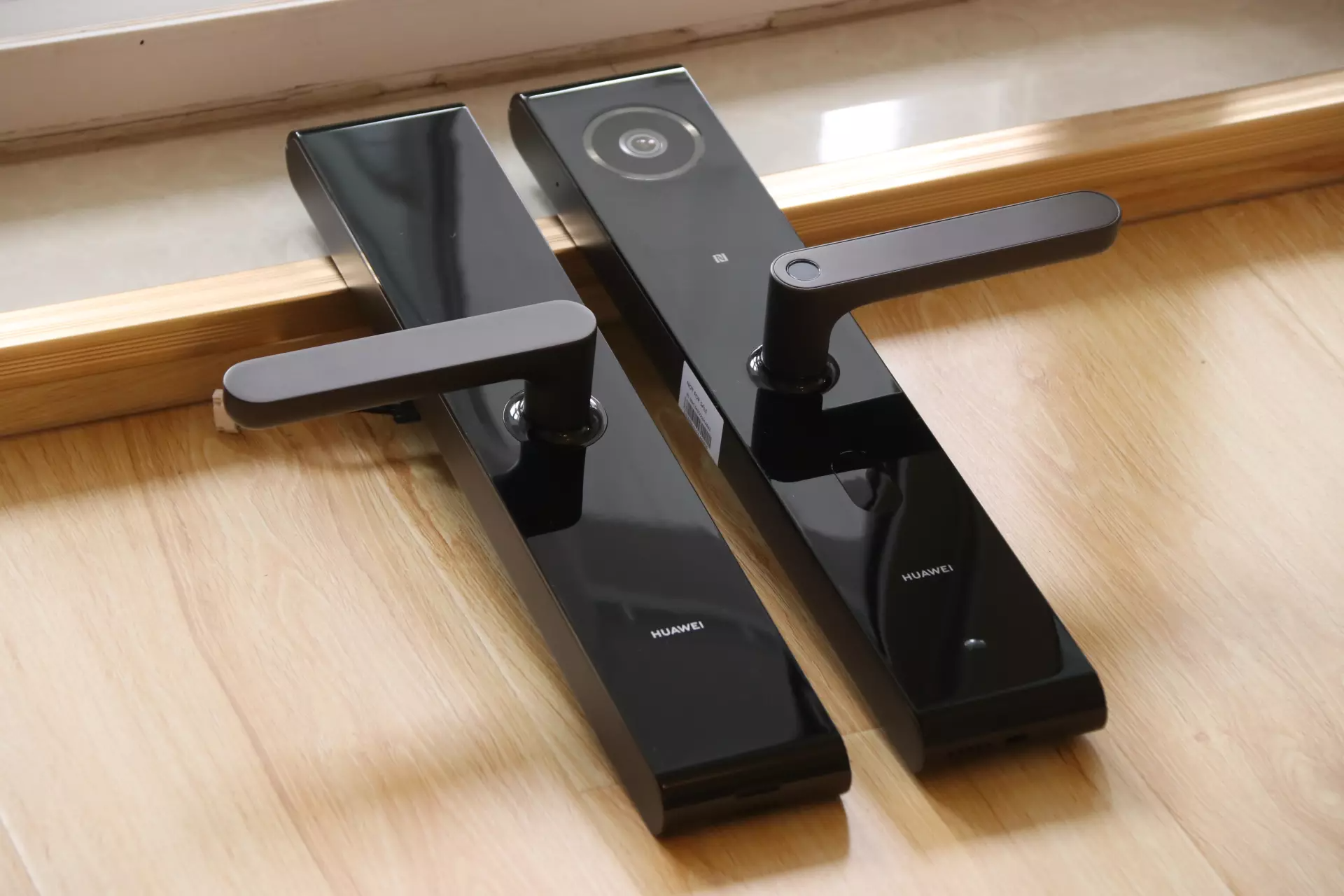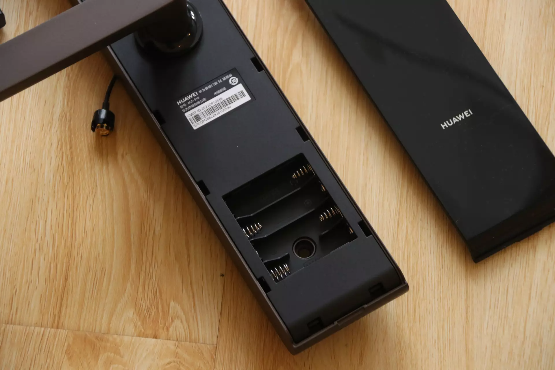 除了线条图之外,还有产品型号,华为logo以及鸿蒙系统logo都有标识。这款门锁是支持鸿蒙系统和华为智慧生活APP的。也就意味着我们可以使用手机远程操控,还能通过摄像头查看门口有什么异常。