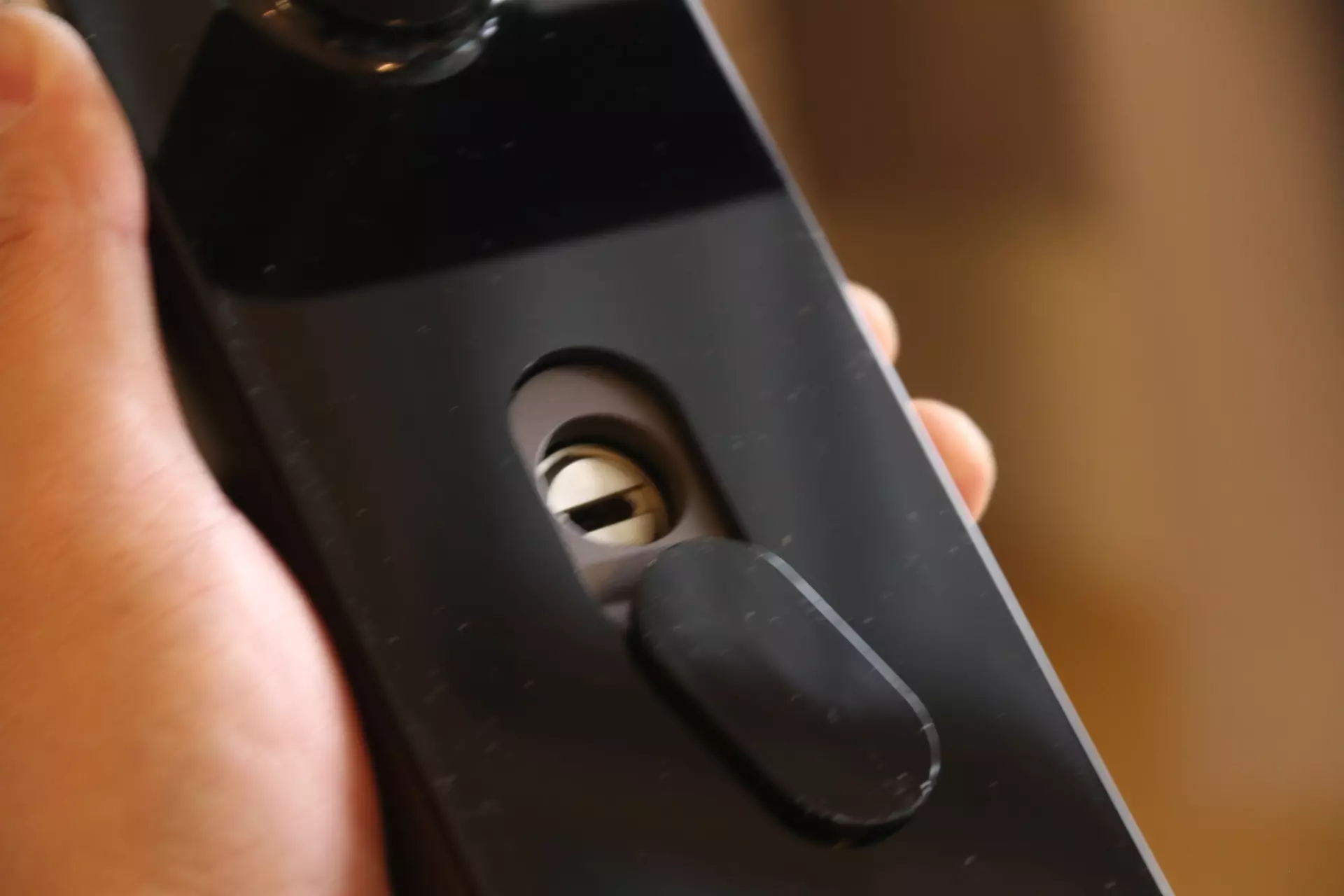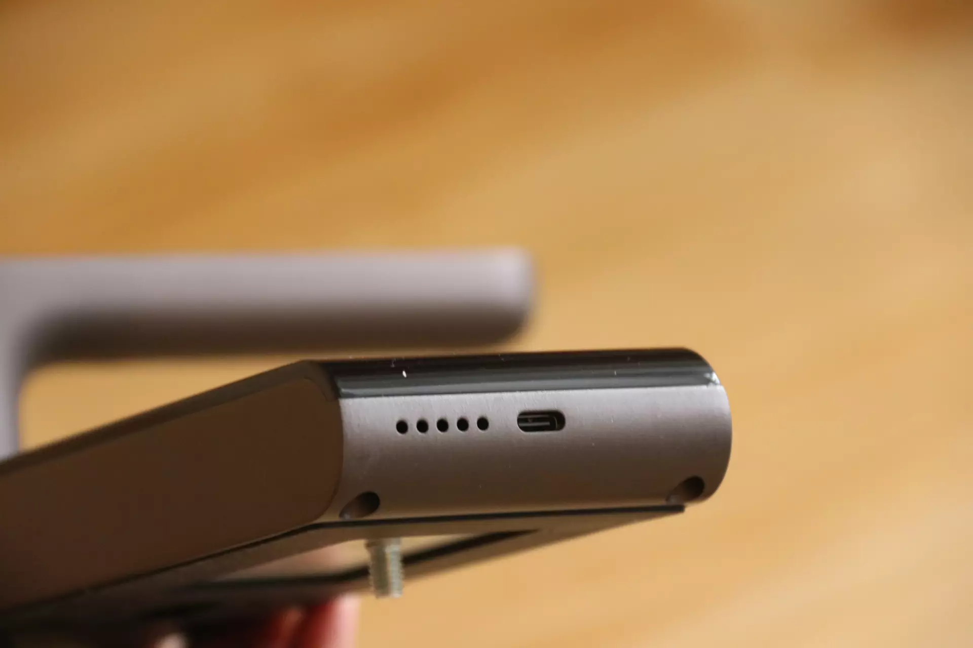 还是外侧面板,在底部位置设计了一个Type-C的充电口,当门锁一点电都没有了,可以用充电宝为其充电开门,不过几乎是用不到。在充电口的左侧有几个小孔,这是它的喇叭孔,各种提醒就是由这里发出来的,声音很洪亮。