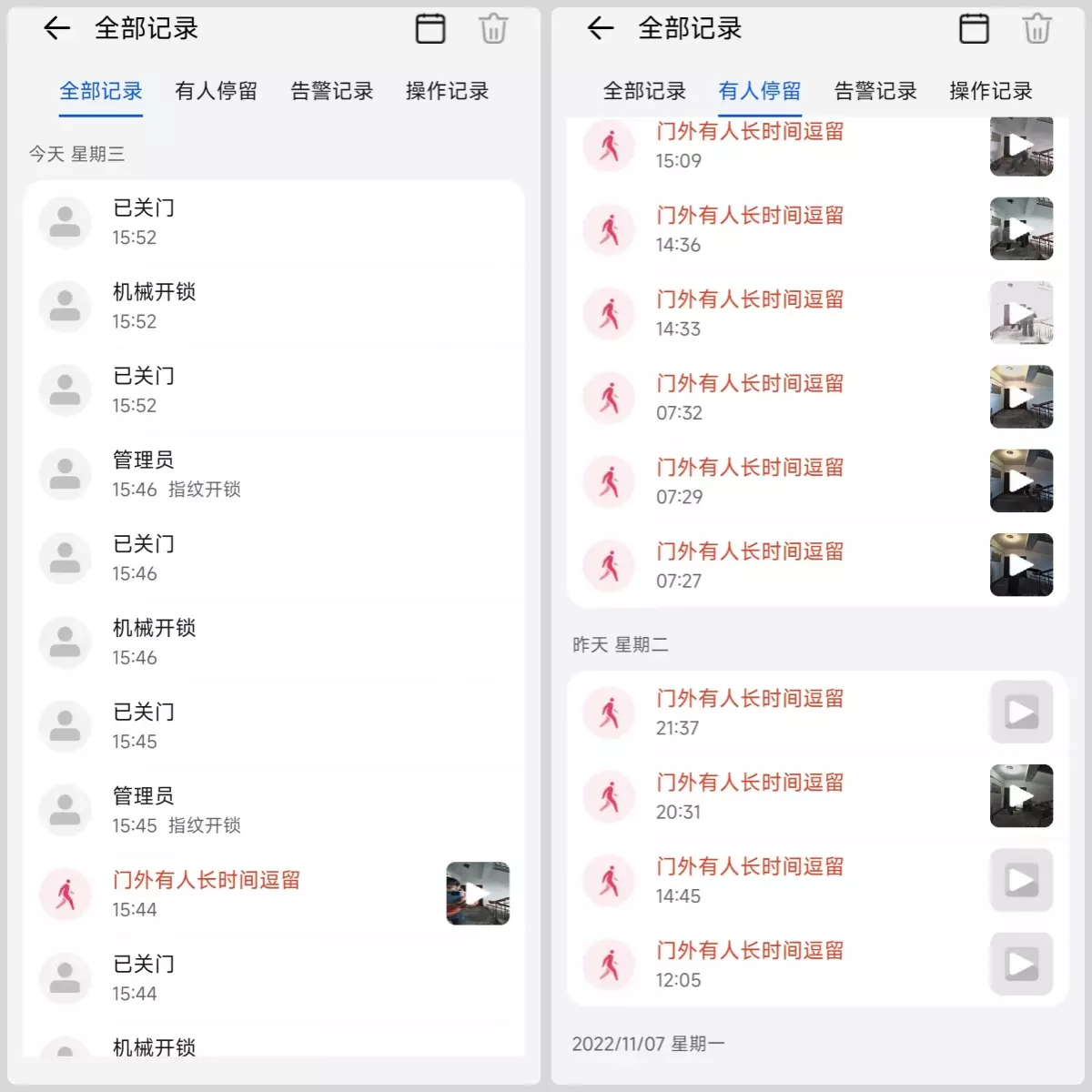 我最关心的就是这个猫眼记录了,点击记录选项旁边的更多,便会来到记录信息的详情页,这里针对不同的触发场景做了分类,包括有人停留、告警记录、操作记录。我们在查看的时候不用来回翻找了,这点设计很贴心。