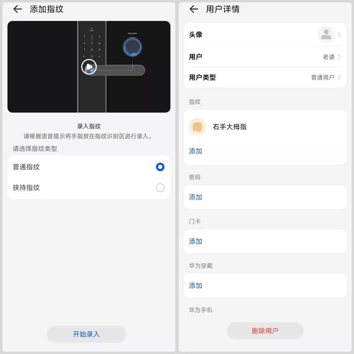 在录入指纹的界面,我们可以看到还有个挟持指纹,我们也可以叫它防挟持指纹,就是在自己被人胁迫开锁的时候专门录入的指纹。当使用这个挟持指纹开锁时,门锁也会照样开启,面板上不会有任何变化,也不会有报警声,但是其他安装华为智慧生活APP的用户会受到求救信息。这个时候收到信息的家人可以第一时间报警,从而保证被胁迫者的安全。