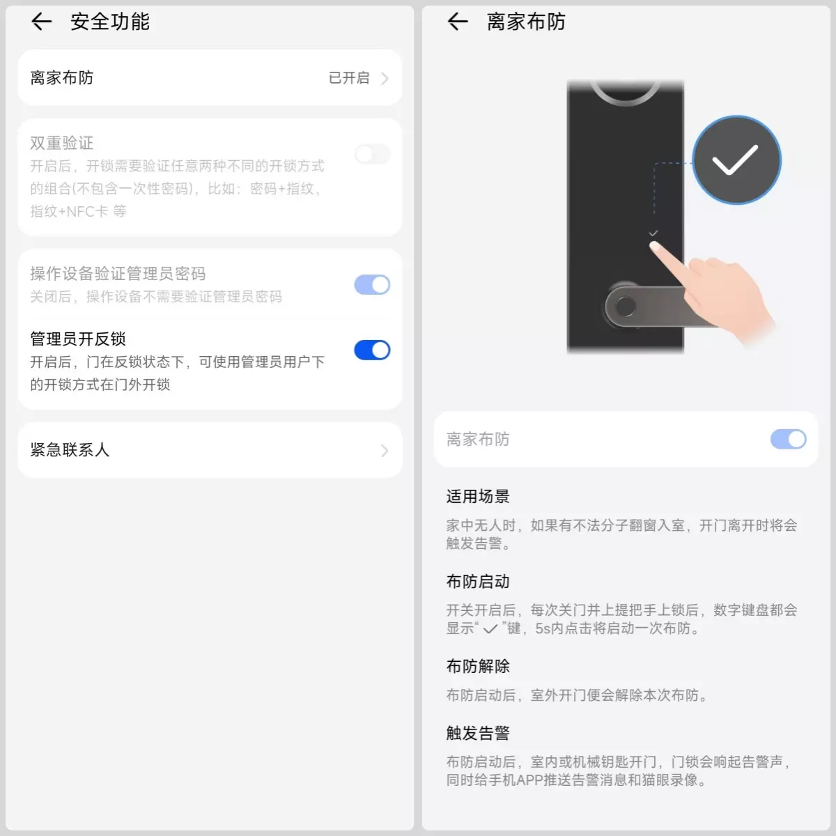 这款华为智能门锁在安全方面做得很到位,除了智能猫眼外,还有离家布防,双重验证等,还可以添加紧急联系人。在离家布防中可以看到不同的触发场景,华为智能门锁SE猫眼版是怎么工作的。
