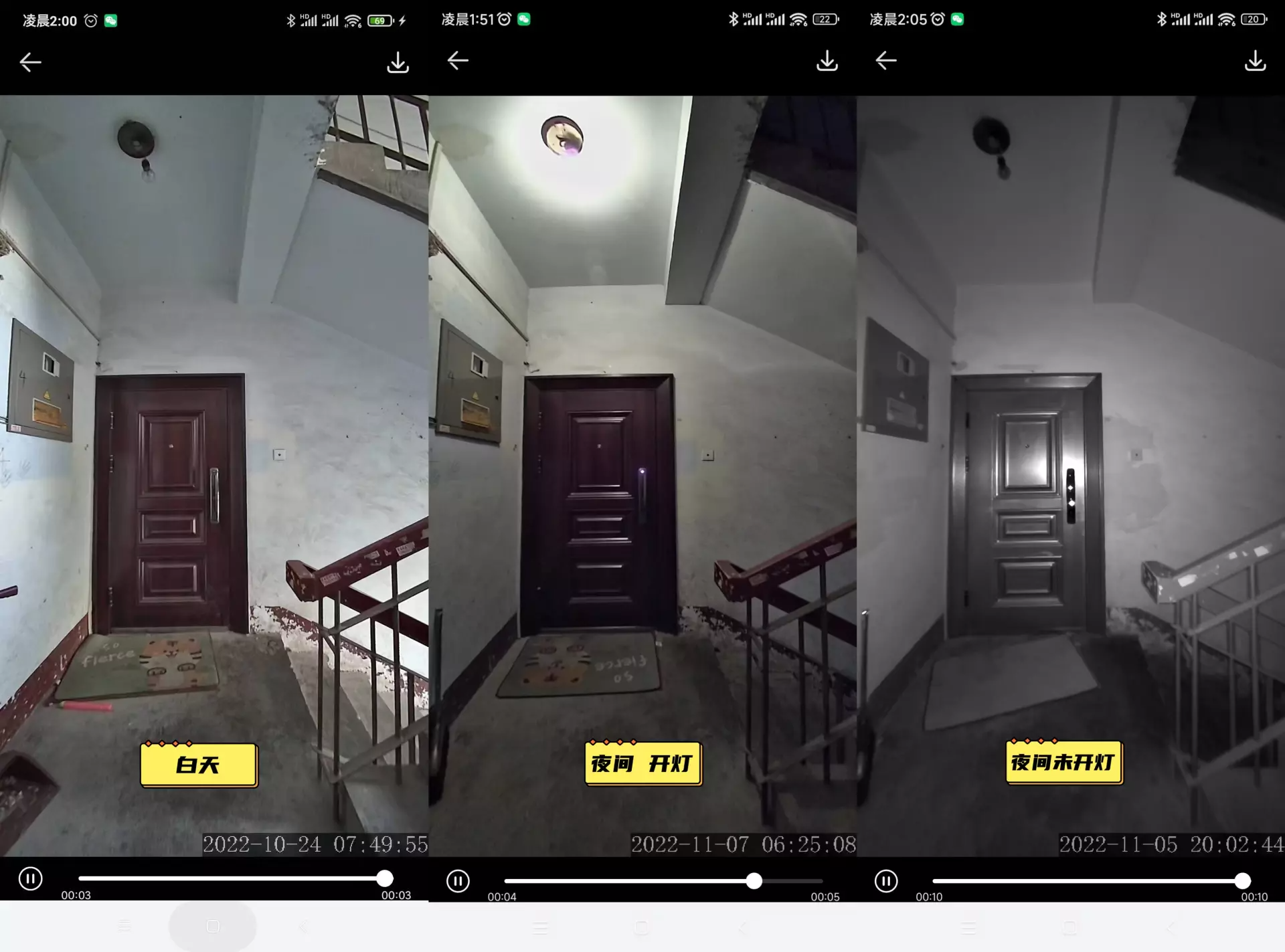 从对比图来看,我觉得无论是白天,还是夜间开灯、关灯下,这颗 1080P 高清猫眼的成像素质真的很出色。特别是在夜间未开灯下,漆黑的环境下一点光亮都没有,能有这样高清晰的成像我已经非常满意了。