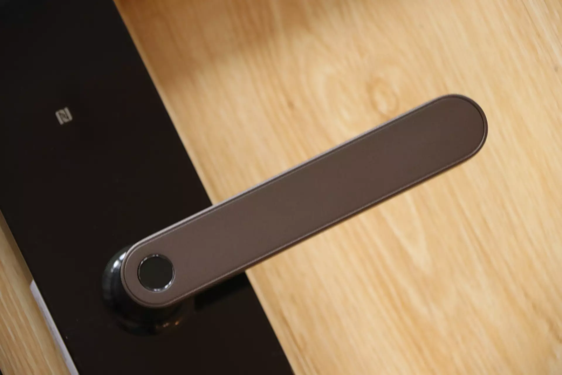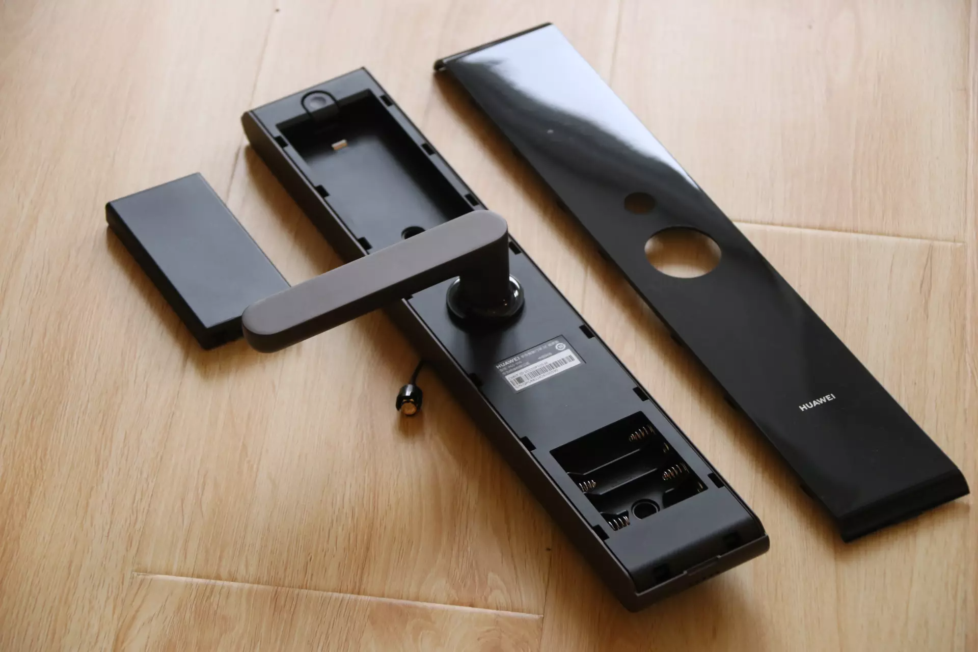 从门把手再往下便是它的机械钥匙孔了,只有在应急的时候才能用到,平时几乎用不上,因此为了不影响美观,还做了隐藏设计。此外在HUAWEI 字体的下方,还有一个红外感应器,当有人在门前逗留时,就是由它感应到并通过猫眼执行抓拍录像的,分工很明确的。