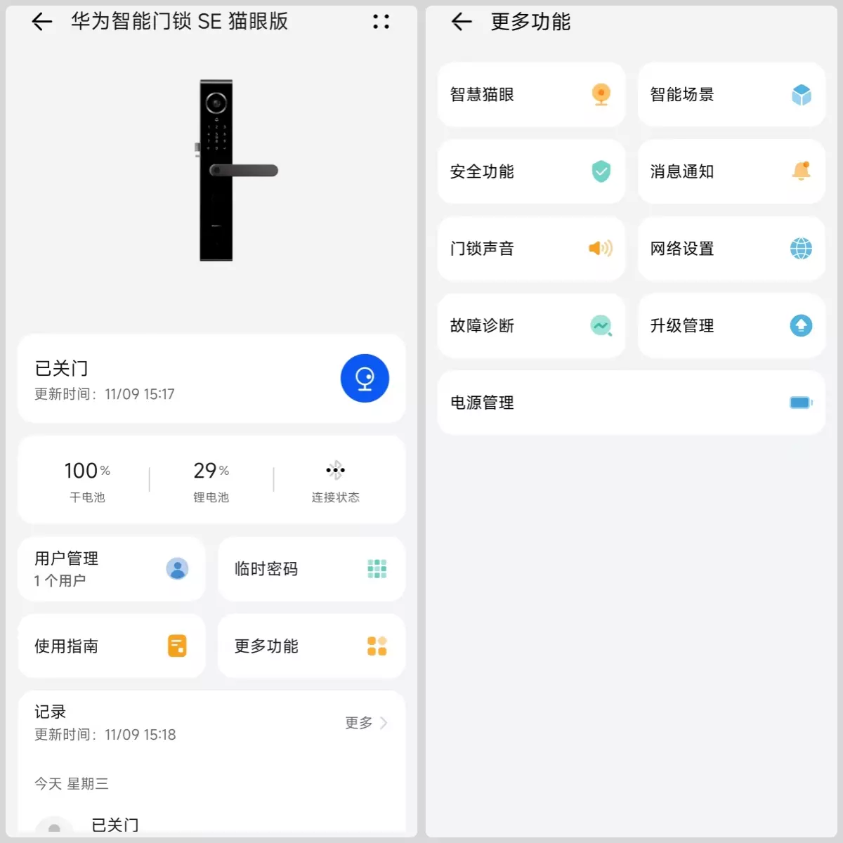 华为智能门锁 SE 猫眼版之所以叫智能门锁,而不是指纹锁,主要还是因为它能够支持远程操控,可以家中的其他智能设备联动。华为的智能家居生态现在做得也很全面了,家中有华为的其他智能设备的话,都可以进行设置场景,联动,从而获得更完美的智能体验。
