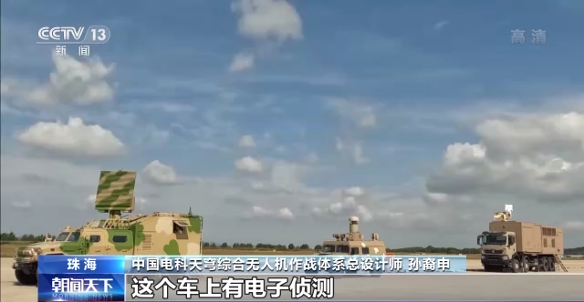 中国电科天穹综合无人机作战体系总设计师 孙裔申:这是电子对抗的车辆,车上有电子侦测,所有这些传感器信息都是汇总在这个指挥中心台子上,空中无人机的信息逃不过这个系统的眼睛,同时有干扰诱骗的方式对无人机进行拦截。