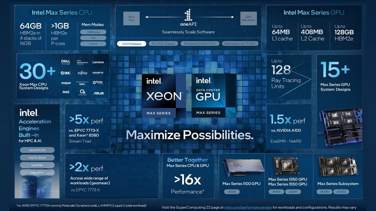 MAX 1100 - 双槽PCIe外形,56个Xe核心和48GB的HBM2e显存,克通过英特尔Xe Link桥接器实现多卡连接,TDP为300W。