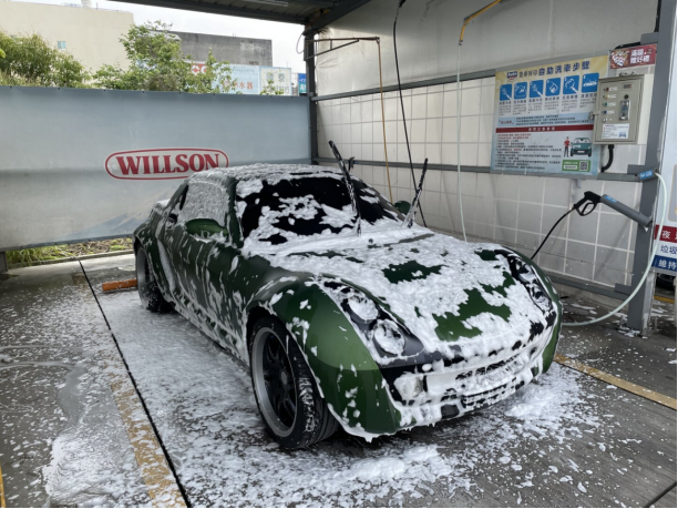 在正式洗车前,喷上自助洗车场的泡沫、洗车精,或是使用铁粉去除剂、柏油去除剂等等药剂…先软化车身脏污,这时候还不能刷洗车身,等待3-5分钟后(视车身脏污情况,但避免放到干掉)就可以用高压水枪冲干净,完成预洗步骤。