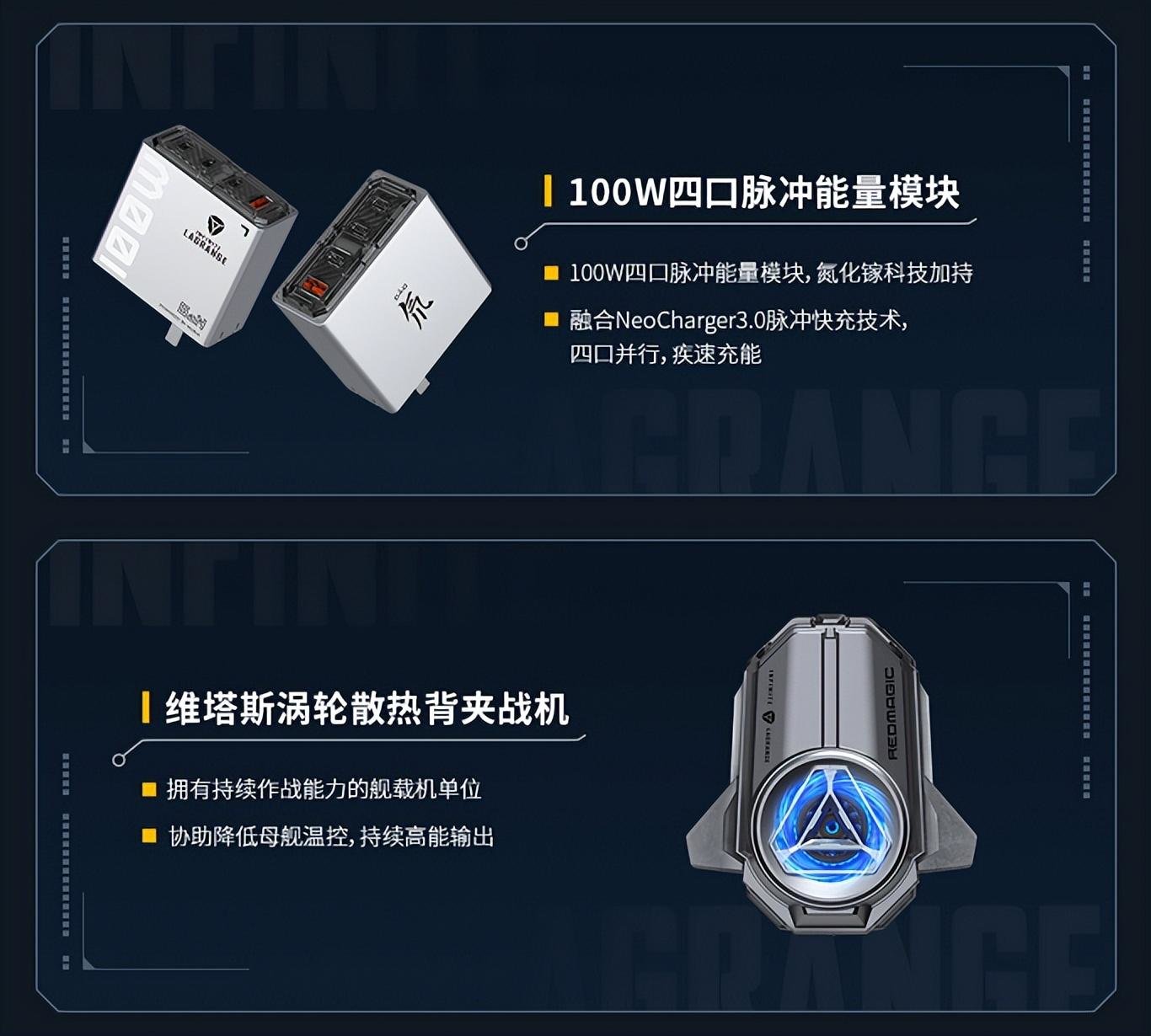 此外,红魔7S Pro×无尽的拉格朗日联名限定套装内的100W四口脉冲能量模块还拥有氮化镓技术加持,该充电器融合了NeoCharger 3.0脉冲快充技术,支持四门并行,可以满足玩家多设备同时疾速充电的需求。维塔斯涡轮散热背夹战机的配备则拥有持续作战能力的舰载机单位,能够协助降低母舰温控,实现持续高能输出,更好的满足游戏玩家持久作战的游戏所需,实现更加的散热效果。