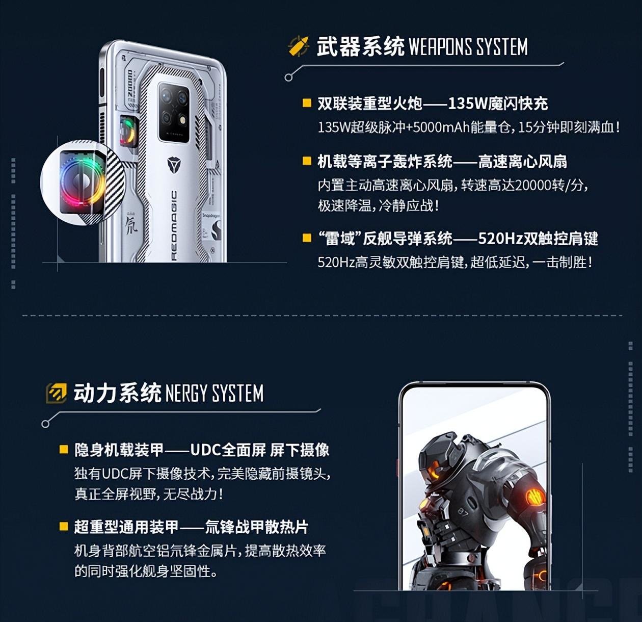 而武器系统则包含了双联装重型火炮135W魔闪快充、机载等离子轰炸系统高速离心风扇、“雷域”反舰导弹系统520Hz双触控肩键,能够确保游戏玩家持久稳定作战,并做到超低延迟,一击制胜。动力系统则是指隐形机载装甲UDC全面屏、超重型通用装甲氘锋战甲散热片,能够轻松点燃无尽战力,提高手机的散热效率并强化舰身坚固性。
