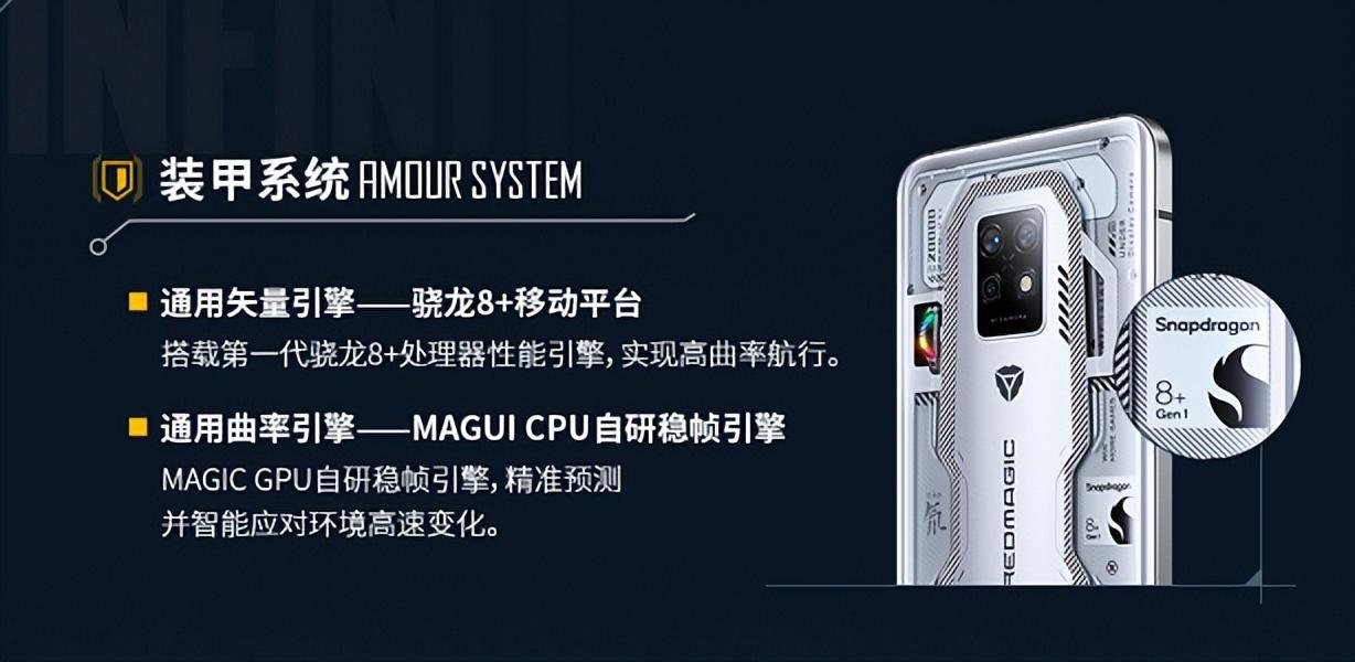 其中,红魔7S Pro定制版的装甲系统包含通用矢量引擎和通用曲率引擎,即搭载了骁龙8+移动平台和MAGUI CPU自研稳帧引擎,能够轻松实现高曲率航行,精准预测并智能应对环境高速变化。