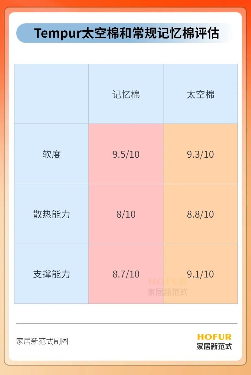 一家独立睡眠用品评估网站Slumbersearch对Tempur太空棉和常规记忆棉两种材料做了评估,如下: