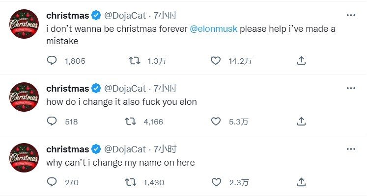 还记得Doja Cat几天前将用户名更改成christmas吗?事情竟有了神转折——Elon Musk收购推特后,由于账号认证规则,蓝标用户不能再改名字了,于是真“圣诞天后”Doja Cat发推“我该怎么改名啊,fxxk you埃隆”“我不想永远当christmas啊马斯克求你帮帮我吧我错了”。