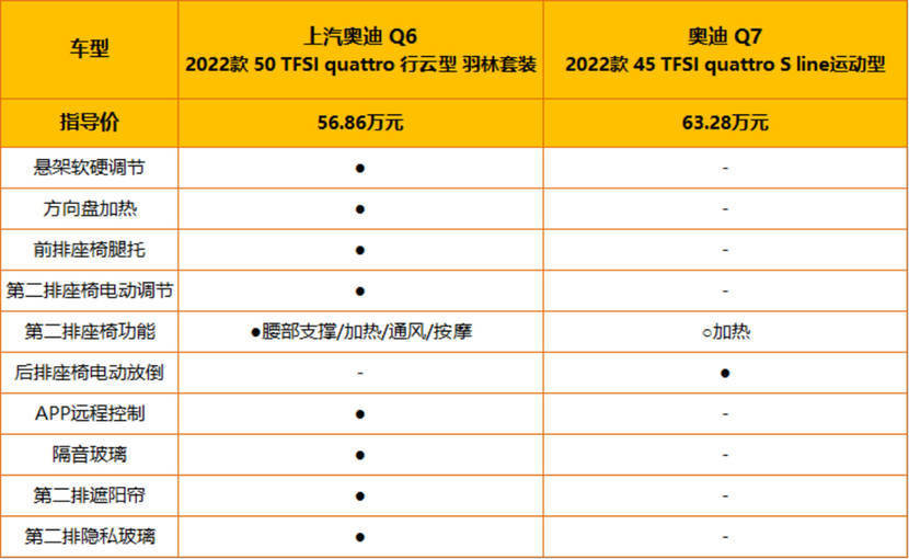 为了更直观地展示两者的差异,我们选择了上汽奥迪Q6 50TFSI行云型和奥迪Q7 45TFSI运动型为示例,看一下他们分别拥有什么样的舒适性配置。两者的指导价接近(56.86万元和63.28万元),落地价大约是63万元和66万元,也相差不大。