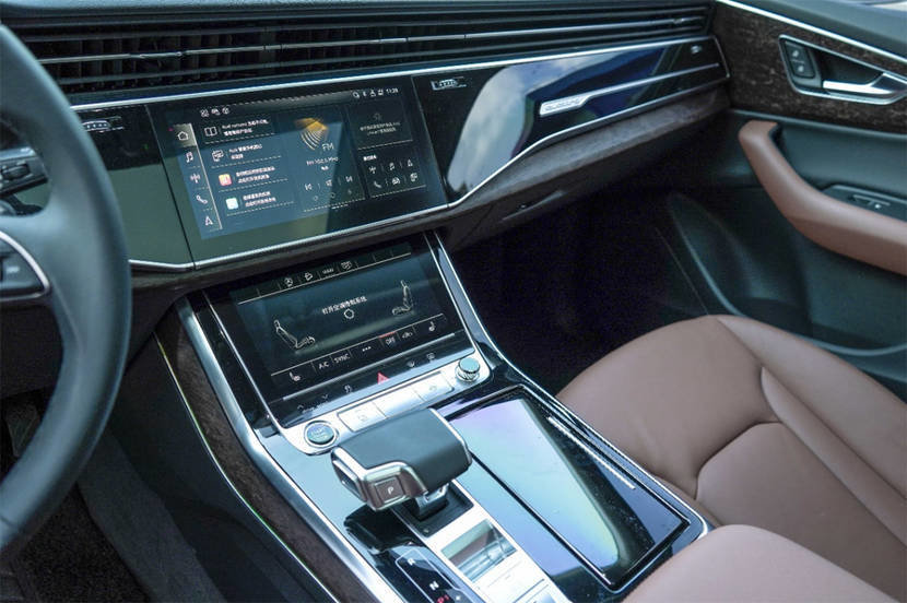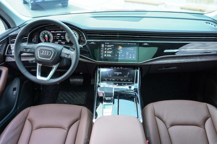 奥迪Q7是另外一种风格,同样很有科技感,也同样拥有三联屏,但是中控屏融合在中控台之内,和副驾驶饰板形成一个整体,上方是贯穿式的空调出风口。电子挡把、少量的实体按键也都能见到。相对而言,Q7就是奥迪比较传统的布局,一直没什么变化。