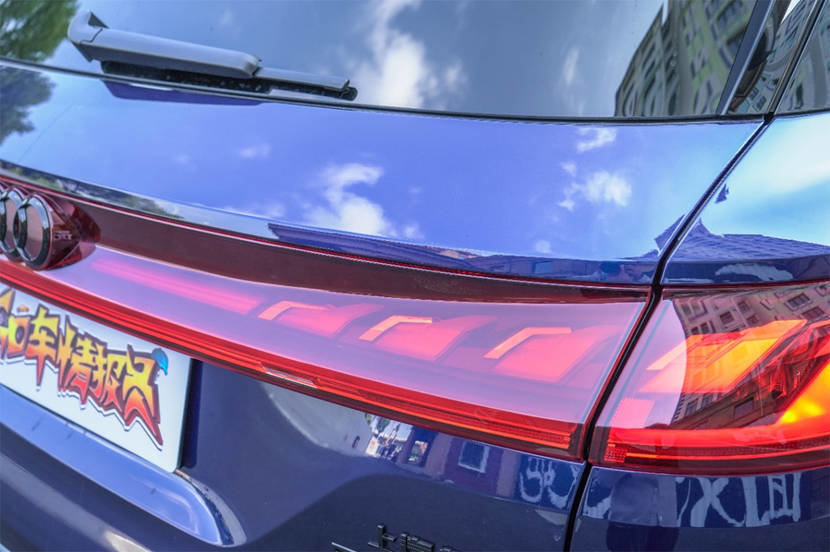 车身的侧面线条和以往的奥迪车型类似,比较平直,车身的上半部分做了黑化处理,显得更年轻。尾部灯光和车头呼应,做成了贯穿的样式,而且比较有新意的是在车尾风挡玻璃上部,有奥迪标志性的quattro投影式刹车灯。