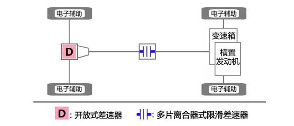 在工作原理上,适时四驱系统通过电子设备检测四个车轮的轮速,当车辆某一车轮处于打滑状态时,系统会立即感知,随后通过制动器对打滑车轮进行制动,通过操作多片式离合器结构的中央限滑差速器进行锁止,将动力传递至拥有附着力的车轮处输出,为车辆提供前进的动力。