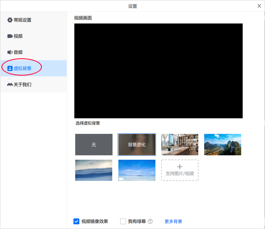 用户可在“设置-虚拟背景”中,选择喜欢的背景照片 / 视频作为会议背景,也可通过“更多背景”下载。如果配有“绿幕”,还能获得更高质量的虚拟背景。