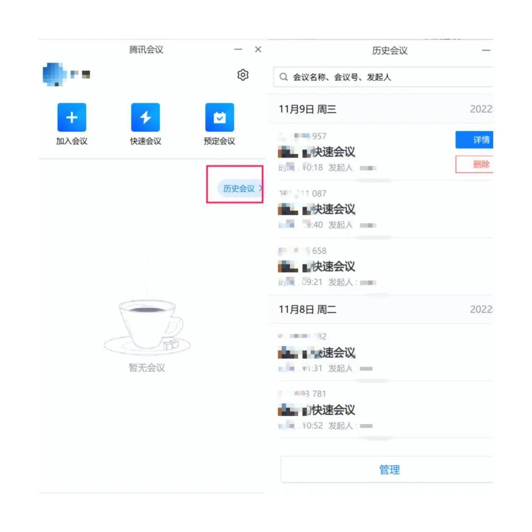 通过首页“历史记录”,可查看会议创建者所有会议信息,包括“会议名称、会议号、发起人”等信息。