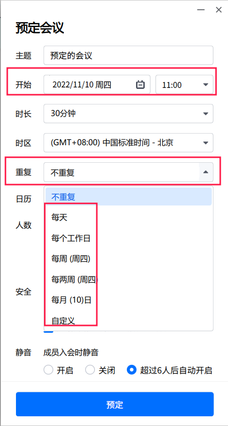 会议创建者可自定义会议周期,如每周一固定的工作例会,可开启固定周期内的循环,让会议预定更灵活、便利。